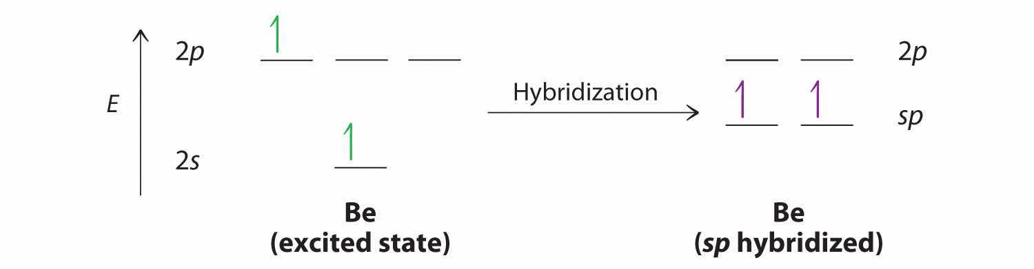 Let’s examine the bonds in BeH2, for example. According to the VSEPR model, BeH2 is a linear compound with four valence electrons and two Be–H bonds. Its bonding can also be described using an atomic orbital approach. Beryllium has a 1s22s2 electron configuration, and each H atom has a 1s1 electron configuration. Because the Be atom has a filled 2s subshell, however, it has no singly occupied orbitals available to overlap with the singly occupied 1s orbitals on the H atoms. If a singly occupied 1s orbital on hydrogen were to overlap with a filled 2s orbital on beryllium, the resulting bonding orbital would contain three electrons, but the maximum allowed by quantum mechanics is two. How then is beryllium able to bond to two hydrogen atoms? One way would be to add enough energy to excite one of its 2s electrons into an empty 2p orbital and reverse its spin, in a process called promotionThe excitation of an electron from a filled atomic orbital to an empty or valence orbital.:
