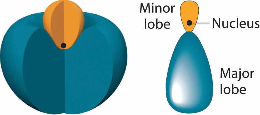 The position of the atomic nucleus with respect to an sp hybrid orbital. The nucleus is actually located slightly inside the minor lobe, not at the node separating the major and minor lobes.