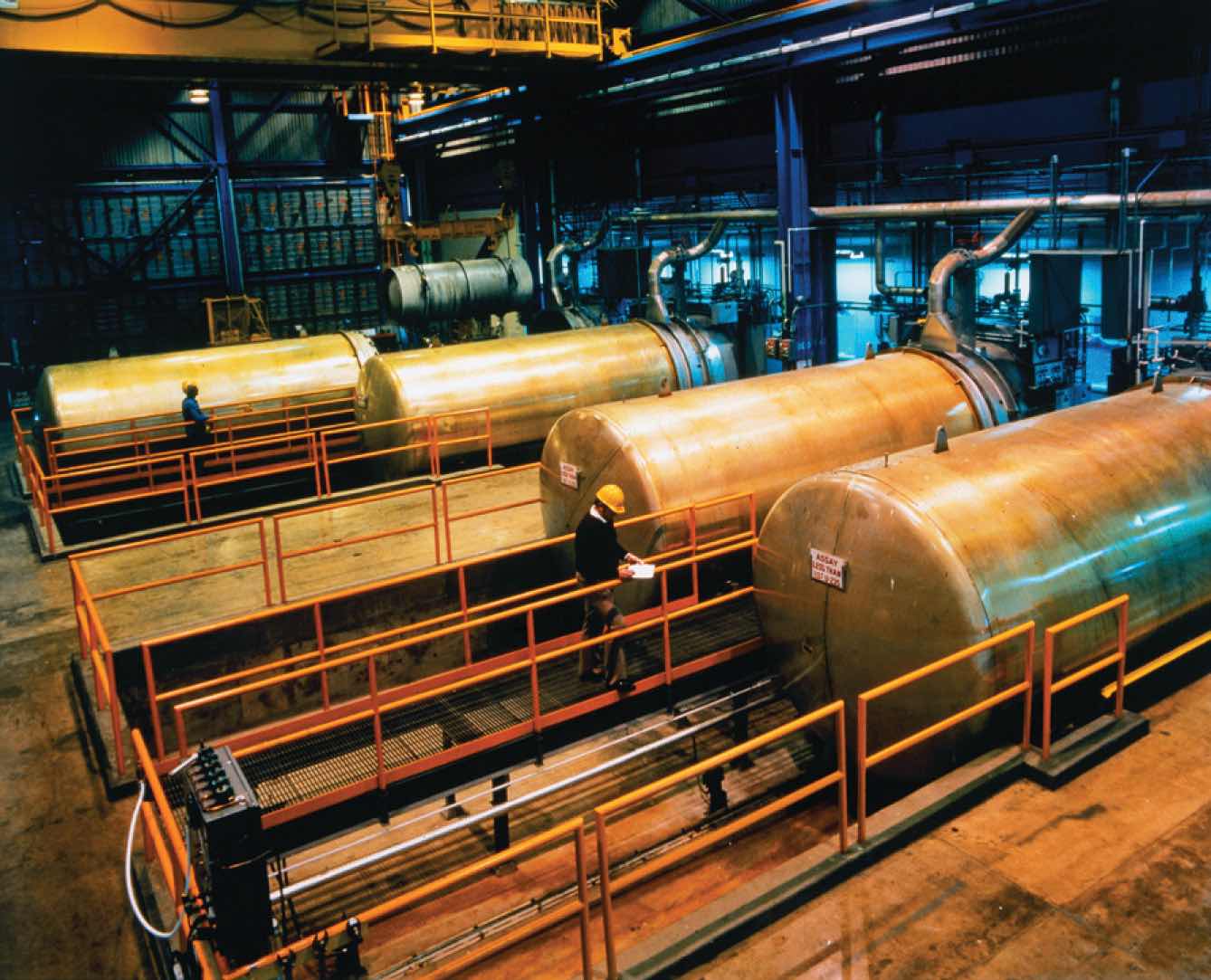 The large cylindrical objects (note the human for scale) are so-called diffuser (actually effuser) units, in which gaseous UF6 is pumped through a porous barrier to partially separate the isotopes. The UF6 must be passed through multiple units to become substantially enriched in 235U.