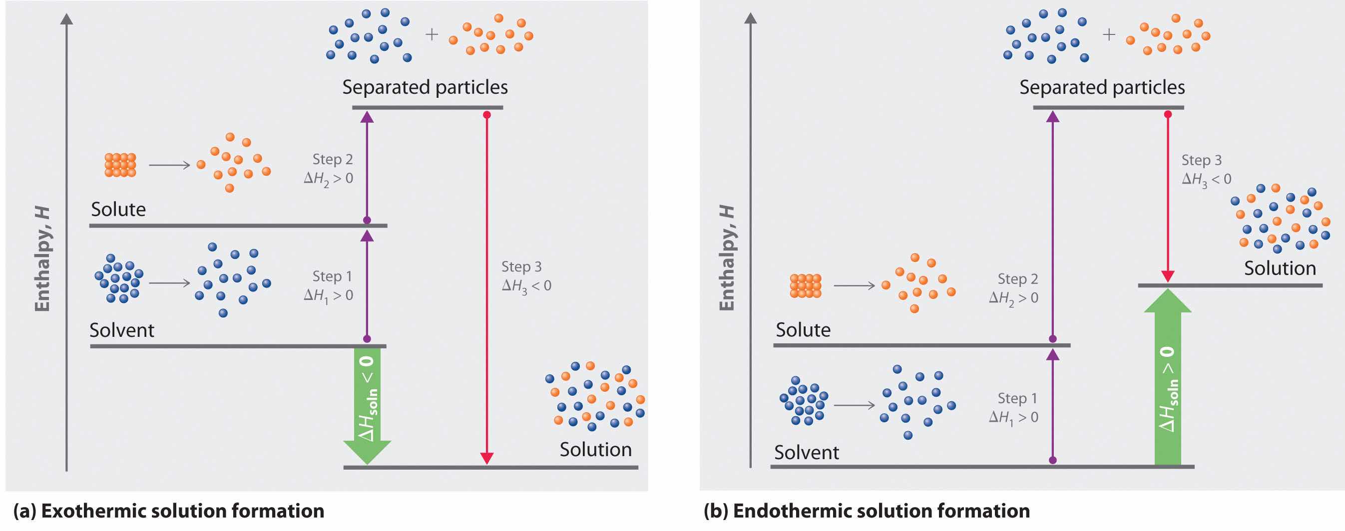 Solvation can be an exothermic or endothermic process depending on the nature of the solute and solvent. In both cases, step 1, separation of the solvent particles, is energetically uphill (ΔH1 > 0), as is step 2, separation of the solute particles (ΔH2 > 0). In contrast, energy is released in step 3 (ΔH3 < 0) because of interactions between the solute and solvent. (a) When ΔH3 is larger in magnitude than the sum of ΔH1 and ΔH2, the overall process is exothermic (ΔHsoln < 0), as shown in the thermochemical cycle. (b) When ΔH3 is smaller in magnitude than the sum of ΔH1 and ΔH2, the overall process is endothermic (ΔHsoln > 0).