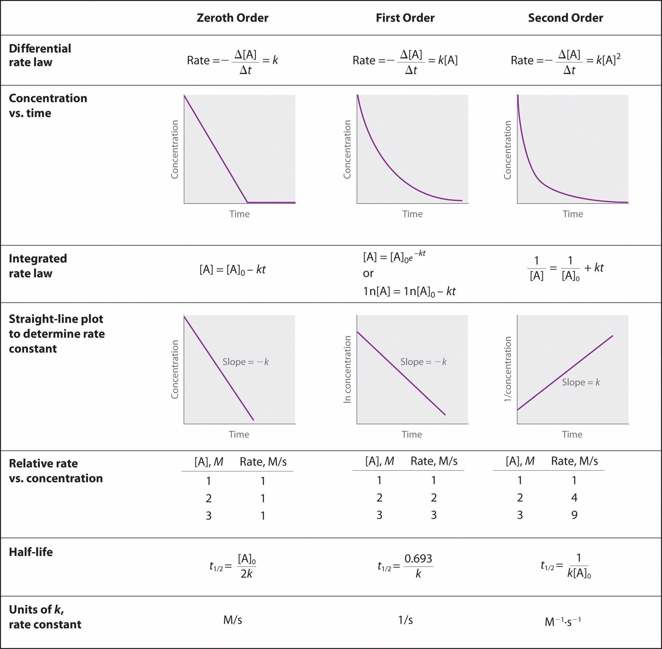 Figure 14.16 Properties of Reactions That Obey Zeroth-, First-, and Second-Order Rate Laws