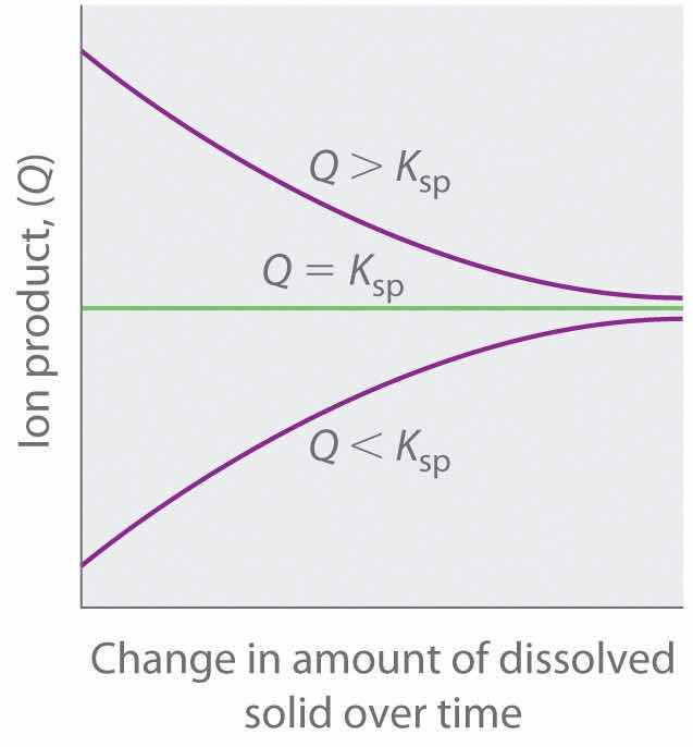 If Q is less than Ksp, the solution is unsaturated and more solid will dissolve until the system reaches equilibrium (Q = Ksp). If Q is greater than Ksp, the solution is supersaturated and solid will precipitate until Q = Ksp. If Q = Ksp, the rate of dissolution is equal to the rate of precipitation; the solution is saturated, and no net change in the amount of dissolved solid will occur.