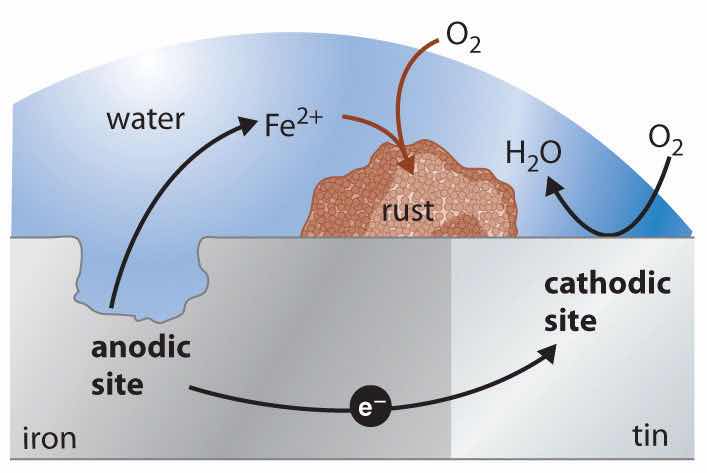 One of the most common techniques used to prevent the corrosion of iron is applying a protective coating of another metal that is more difficult to oxidize. Faucets and some external parts of automobiles, for example, are often coated with a thin layer of chromium using an electrolytic process that will be discussed in Section 19.7 "Electrolysis". With the increased use of polymeric materials in cars, however, the use of chrome-plated steel has diminished in recent years. Similarly, the “tin cans” that hold soups and other foods are actually made of steel coated with a thin layer of tin. Neither chromium nor tin is intrinsically resistant to corrosion, but both form protective oxide coatings.