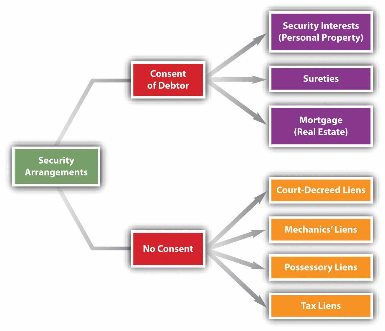 Having discussed in Chapter 10 "Secured Transactions and Suretyship" security interests in personal property and suretyship—two of the three common types of consensual security arrangements—we turn now to the third type of consensual security arrangement, the mortgage. We also discuss briefly various forms of nonconsensual liens (see Figure 11.1 "Security Arrangements").