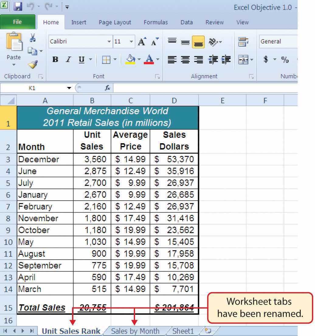 Figure 1.61 "Final Appearance of the Excel Objective 1.0 Workbook" shows the final appearance of the Excel Objective 1.0 workbook after the worksheet tabs have been renamed and moved.