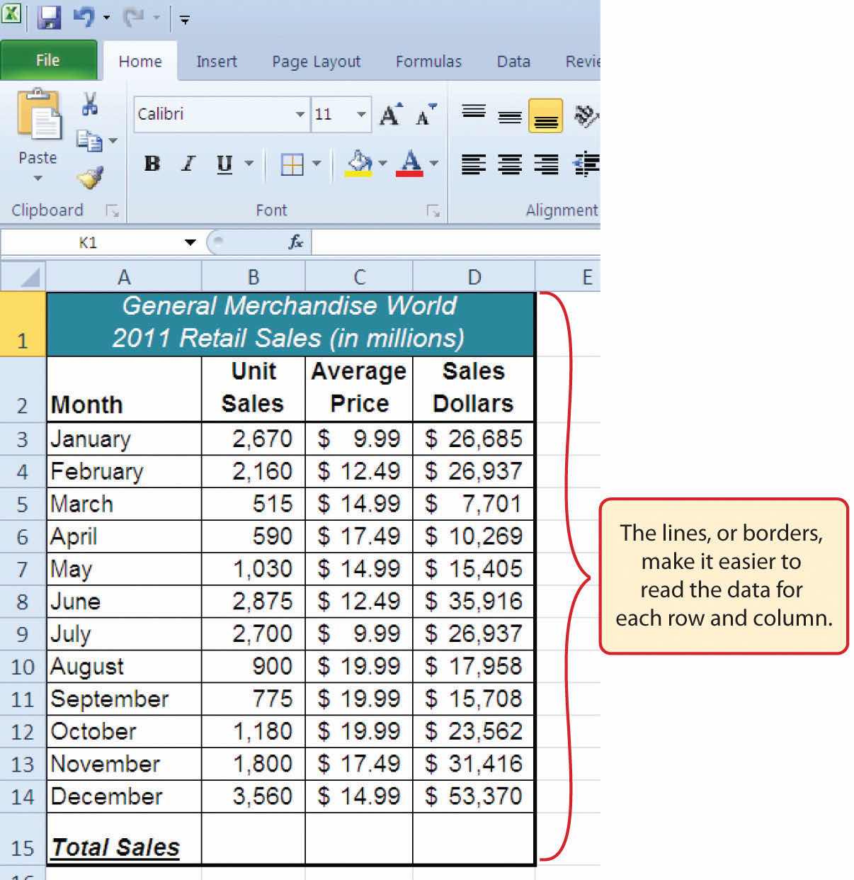 In Excel, adding custom lines to a worksheet is known as adding borders. BordersLines that are added to a worksheet to separate the data in columns and rows. are different from the grid lines that appear on a worksheet and that define the perimeter of the cell locations. The Borders command lets you add a variety of line styles to a worksheet that can make reading the worksheet much easier. The following steps illustrate methods for adding preset borders and custom borders to a worksheet: