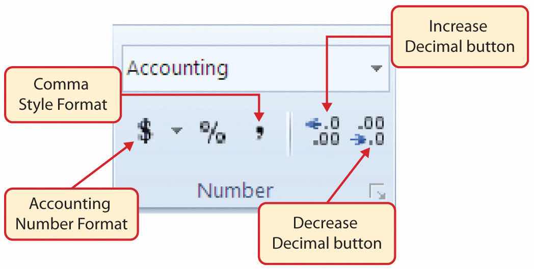 Click the Comma Style button in the Number group of commands in the Home tab of the Ribbon (see Figure 1.37 "Number Group of Commands").