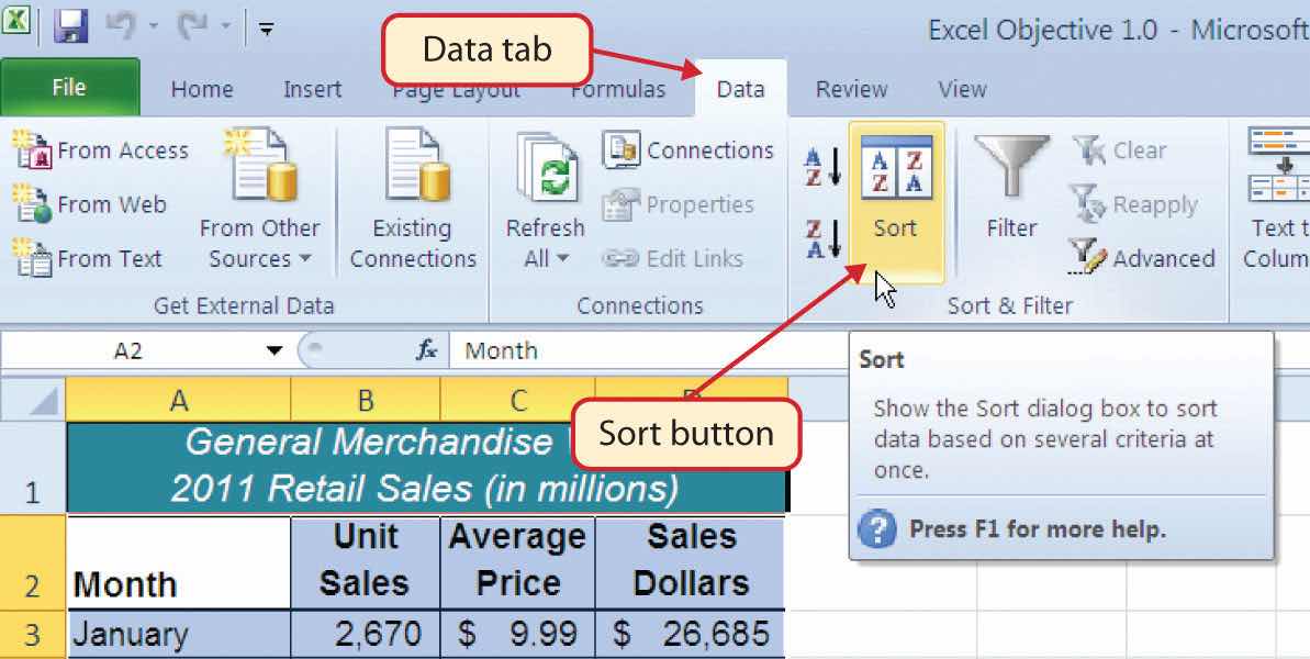 As mentioned earlier in this section, a chart is a tool that enables worksheet readers to analyze data quickly to spot key trends or patterns. Another powerful tool that provides similar benefits is the SortAn Excel command used to rank the data in a worksheet based on designated criteria. command. This feature ranks the rows of data in a worksheet based on designated criteria. The following steps demonstrate how the Sort command is used to rank the data in the Sheet2 worksheet: