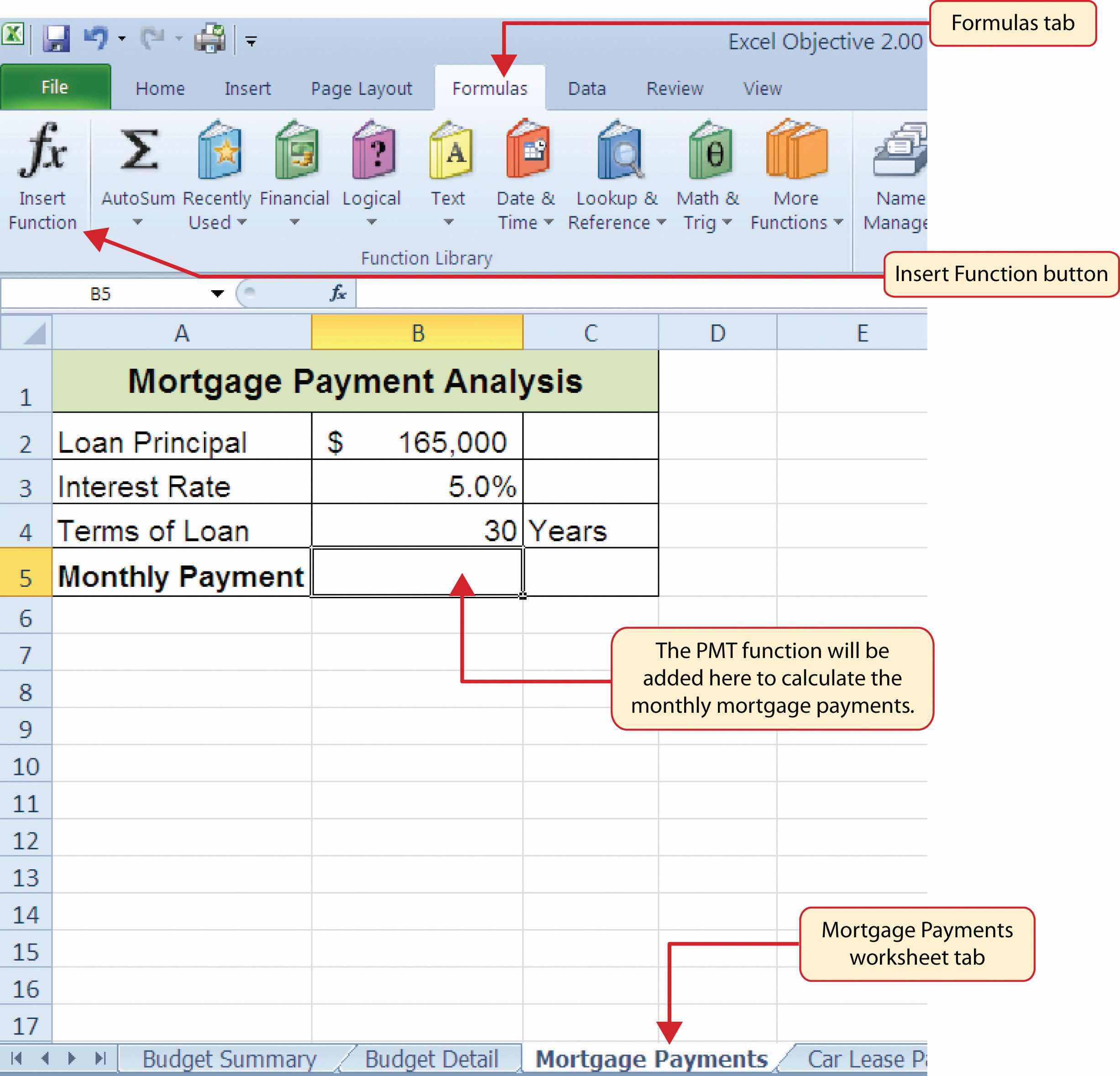 We will use the PMT function in the Personal Budget workbook to calculate the monthly mortgage payments for a house. These calculations will be made in the Mortgage Payments worksheet and then displayed in the Budget Summary worksheet through a cell reference link. So far we have demonstrated several methods for adding functions to a worksheet. The following steps explain a new method using the Insert Function command for adding the PMT function: