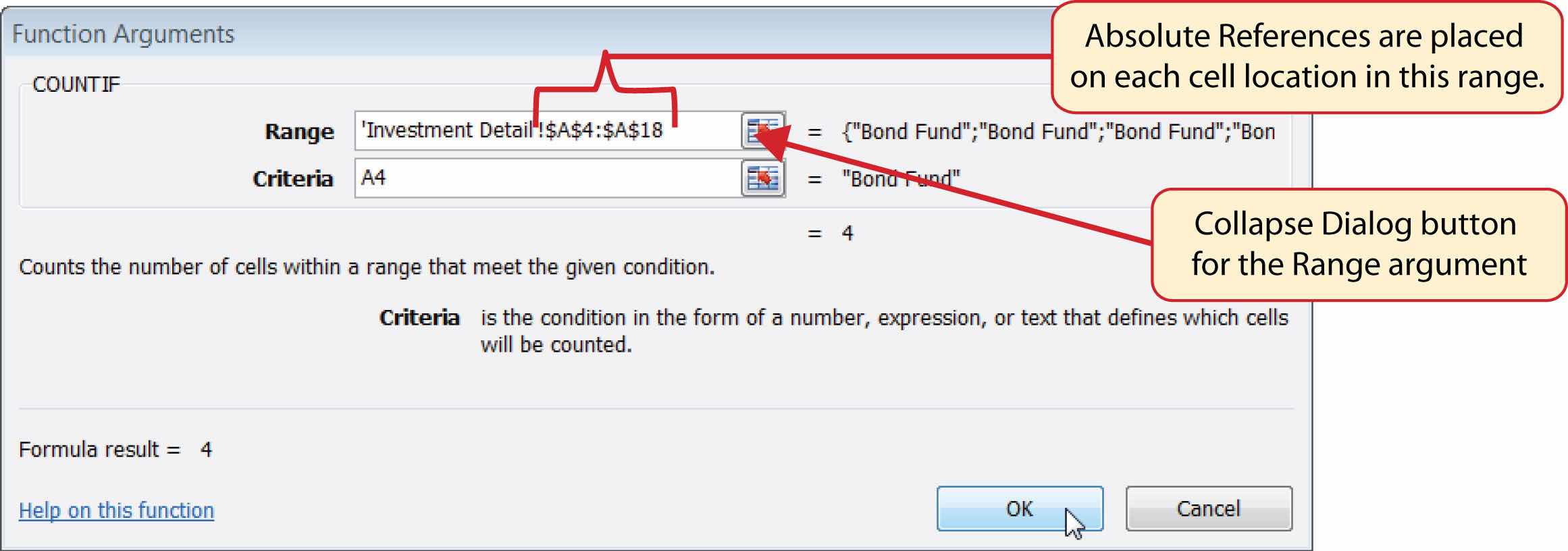 - Click in the Range argument input box and place an absolute reference on the range A4:A18. This is done by typing a dollar sign ($) in front of the column letter and row number for both cells in the range. Alternatively, place the insertion point after the 4 in cell reference A4 and press the F4 key on your keyboard. Then place the insertion point after the 8 in cell reference A18 and press the F4 key. This will add the $ to the appropriate positions automatically.