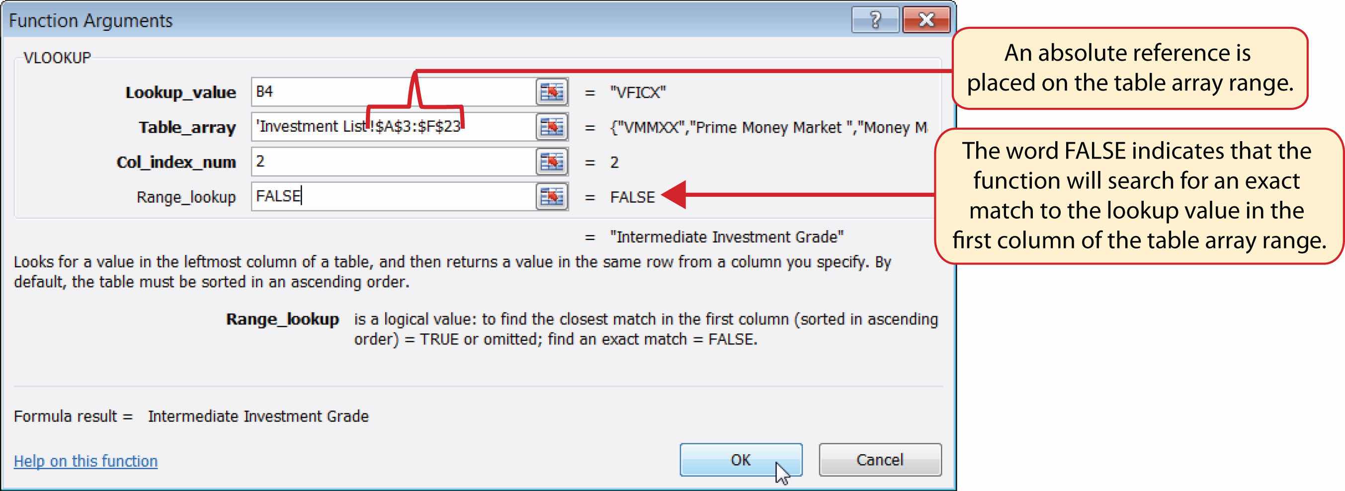 Figure 3.43 Completed Function Arguments Dialog Box for the VLOOKUP Function