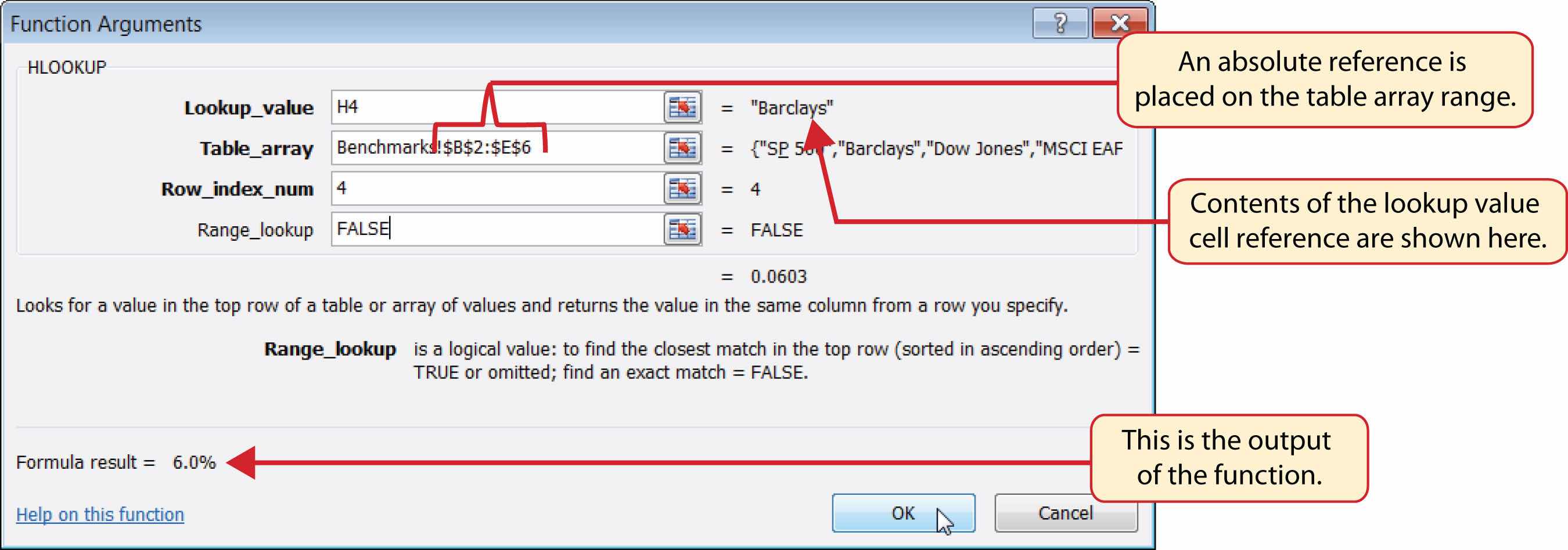 Figure 3.47 "Completed Portfolio Summary Worksheet" shows the output of the HLOOKUP function. Notice that the output of the function in cell G4 is 6.0%. This is because the lookup value was defined with the entry in cell H4, which is the Barclays index. Looking at Figure 3.45 "Benchmarks Worksheet", if you count the first row of the table array range as Row 1, the value 6.03% is the fourth row in the Barclays column. Since the values in Column G on the Portfolio Summary worksheet are set to 1 decimal place, the value is displayed as 6.0%.
