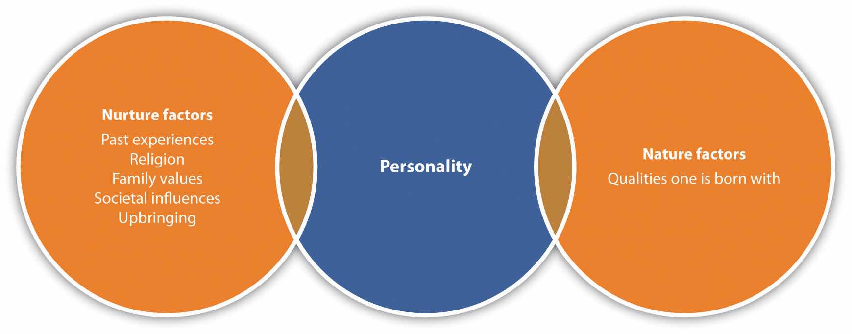 Although there is debate between whether or not our personalities are inherent when we are born (nature) versus the way we grew up (nurture), most researchers agree that personality is usually a result of both nature and our environmental/education experiences. For example, you have probably heard someone say, “She acts just like her mother.” She likely behaves that way because she was born with some of her mother’s traits, as well as because she learned some of the behaviors her mother passed to her while growing up.