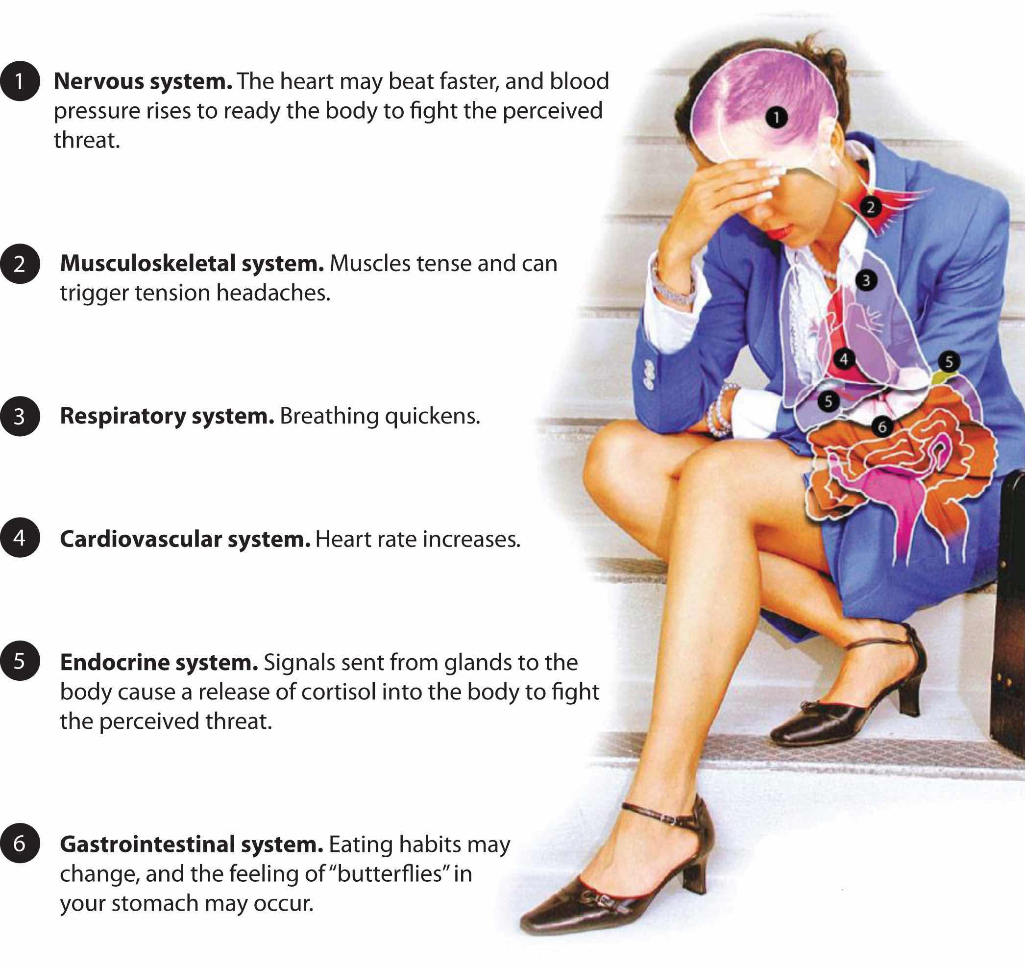 Our bodies go through a number of changes when we are faced with a stressor. From prehistoric times, physical changes in our body had to occur in order to prepare us to handle the stress. For example, we needed to be able to run fast to get away from something that could hurt us or we needed the energy to obtain food. This is called the fight or flight responsePhysiological reactions in the body that enable us to mobilize to deal with a stressful situation.. This concept was developed by Walter Cannon in the 1920s, and he believed that these reactions in the body enabled us to mobilize to deal with a stressful situation.Brian Luke Seaward, Managing Stress: Principles and Strategies (Jones and Bartlett Publishing), 6. More recent research has shown the addition of “freeze” to the response. This occurs when the fight or flight response didn’t work—or we were unable to react quickly enough to fight or flight, and we “play dead” or become immobilized. This response is as natural as fight or flight in our body chemistry. Consider the person attacked by a bear who plays dead and survives. The person couldn’t run (flight) and couldn’t effectively fight against the bear, so the freeze reaction (or the “do nothing,” play dead) reaction can sometimes work. We use the freeze reaction in response to stress triggers at work. For example, we can’t just leave (flight), as we typically need the job to pay our bills; it also may not be worth it to fight, so we freeze in response to the situation. Although this is an oversimplification of the body’s chemistry, it illustrates the point that the flight-fight-freeze response is actually a very prehistoric event. Today, even though our stresses may be different, our body still reacts the same way as it did in prehistoric times. To fully understand how stress impacts us, we need to understand how our bodies handles stress. When our brains initially perceive a threat, a few physiological effects, Figure 3.2 "Physiological Effects of Stress", occur within each system of our bodies.