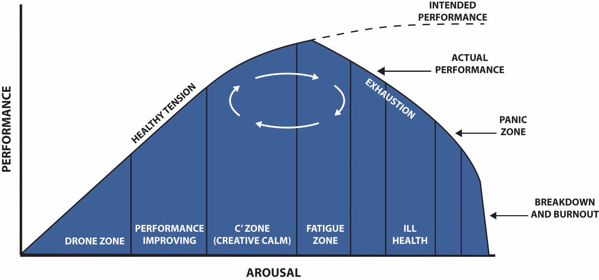 The Human Function Curve, originally developed by Peter Nixon, says there are different levels of stress that we may experience and our stress level affects our level of performance. He calls any state where we are awake and reacting to stimuli an arousal state, such as being at work. If we compare the amount of stress to our performance, our performance actually improves when we experience eustress. However, according to this model, there is a point where chronic stress can impede our performance. Looking at Figure 3.1 "The Human Function Curve", you can see in the drone zone, for example, that our performance is low. We may be bored and not have enough positive stress for us to perform at a higher level. In the C zone, for example, we may experience eustress, which raises our performance. However, when we reach the fatigue zone, we could be experiencing chronic stress, which impedes our performance.
