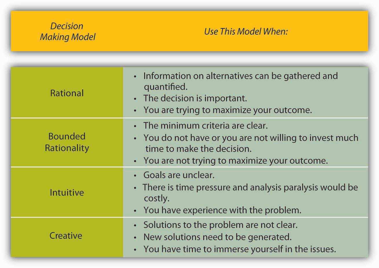 The bounded rationality modelAccording to this model, individuals knowingly limit their options to a manageable set and choose the first acceptable alternative without conducting an exhaustive search for alternatives. of decision making recognizes the limitations of our decision-making processes. According to this model, individuals knowingly limit their options to a manageable set and choose the first acceptable alternative without conducting an exhaustive search for alternatives. An important part of the bounded rationality approach is the tendency to satisficeTo accept the first alternative that meets minimum criteria. (a term coined by Herbert Simon from satisfy and suffice), which refers to accepting the first alternative that meets your minimum criteria. For example, many college graduates do not conduct a national or international search for potential job openings. Instead, they focus their search on a limited geographic area, and they tend to accept the first offer in their chosen area, even if it may not be the ideal job situation. Satisficing is similar to rational decision making. The main difference is that rather than choosing the best option and maximizing the potential outcome, the decision maker saves cognitive time and effort by accepting the first alternative that meets the minimum threshold.