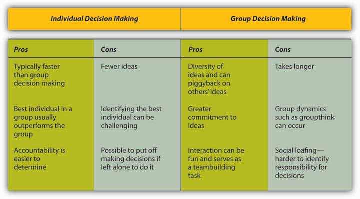 The answer to this question depends on several factors. Group decision making has the advantage of drawing from the experiences and perspectives of a larger number of individuals. Hence, a group may have the potential to be more creative and lead to more effective decisions. In fact, groups may sometimes achieve results beyond what they could have done as individuals. Groups may also make the task more enjoyable for the members. Finally, when the decision is made by a group rather than a single individual, implementation of the decision will be easier, because group members will be more invested in the decision. If the group is diverse, better decisions may be made, because different group members may have different ideas based on their backgrounds and experiences. Research shows that for top management teams, diverse groups that debate issues make decisions that are more comprehensive and better for the bottom line.Simons, T., Pelled, L. H., & Smith, K. A. (1999). Making use of difference: Diversity, debate, decision comprehensiveness in top management teams. Academy of Management Journal, 42, 662–73.