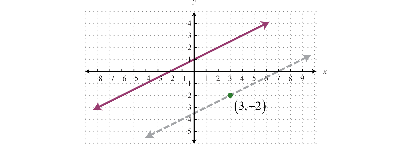 Through the point we found a parallel line,, shown as a dashed line. Notice that the slope is the same as the given line, , but the y-intercept is different.