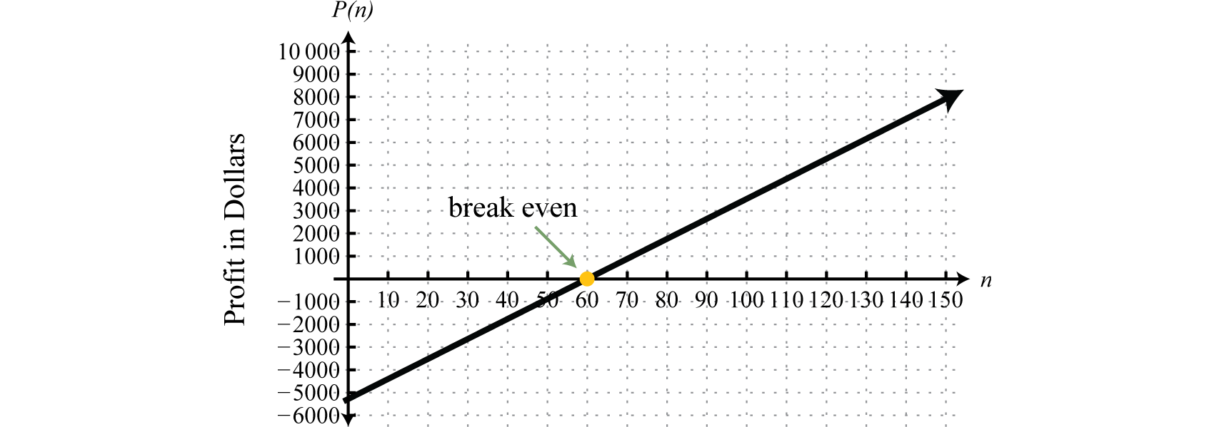 It is often important to determine how many items must be produced and sold to break even. To break even means to neither have a gain nor a loss; in this case, the profit will be equal to zero. To determine the breakeven pointThe point at which profit is neither negative nor positive; profit is equal to zero., set the profit function equal to zero and solve: