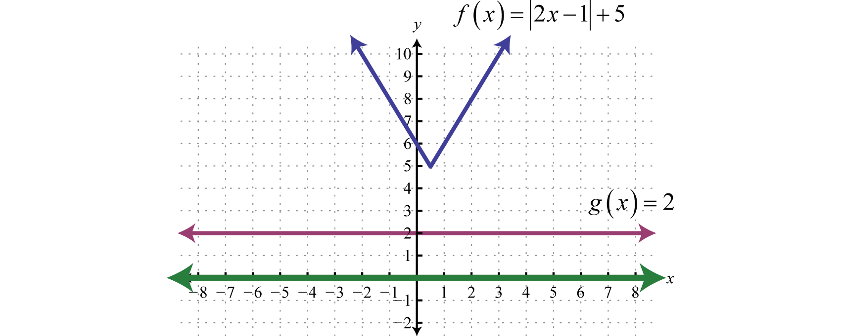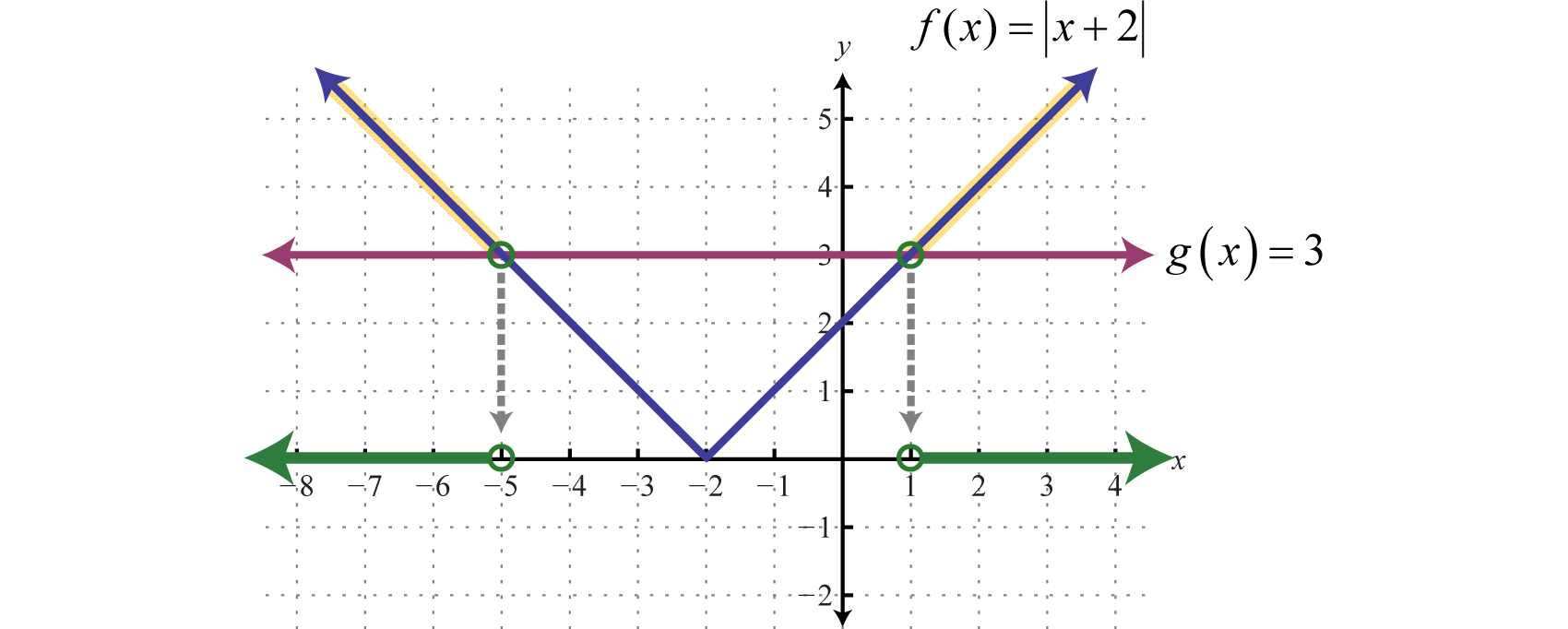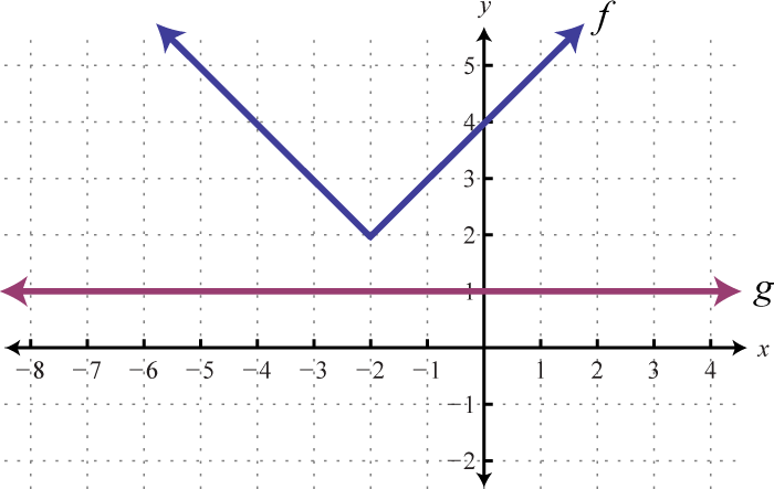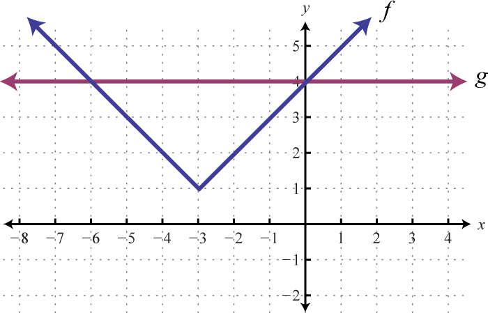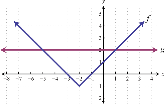 To visualize these solutions, graph the functions on either side of the equal sign on the same set of coordinate axes. In this case, is an absolute value function shifted two units horizontally to the left, and is a constant function whose graph is a horizontal line. Determine the x-values where