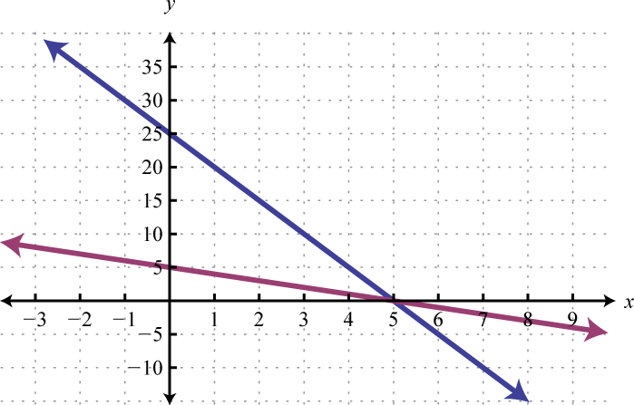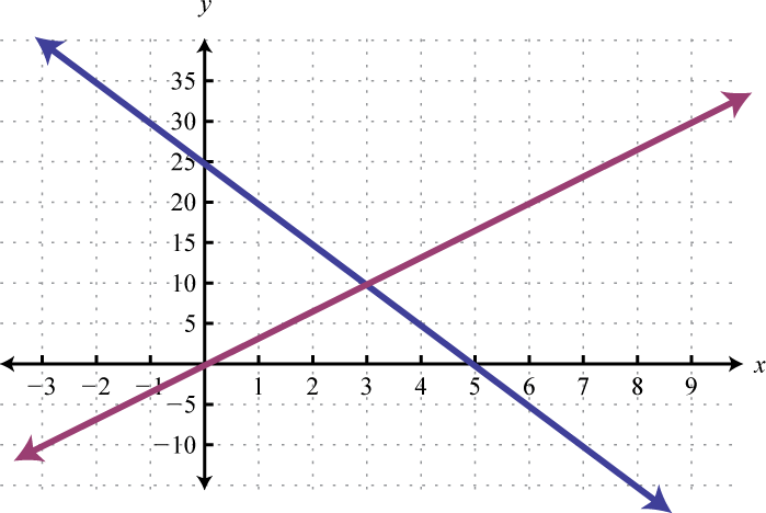 To summarize, linear systems described in this section consist of two linear equations each with two variables. A solution is an ordered pair that corresponds to a point where the two lines intersect in the rectangular coordinate plane. Therefore, one way to solve linear systems is by graphing both lines on the same set of axes and determining the point where they cross. This describes the graphing methodA means of solving a system by graphing the equations on the same set of axes and determining where they intersect. for solving linear systems.