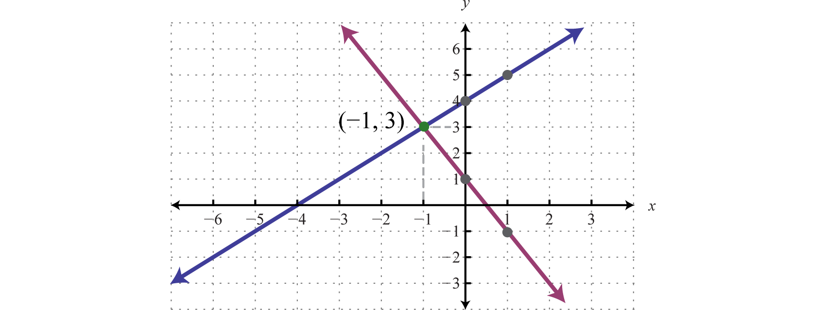 Use the graph to estimate the point where the lines intersect and check to see if it solves the original system. In the above graph, the point of intersection appears to be (−1, 3).