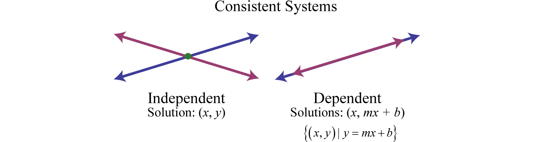 A system with at least one solution is called a consistent systemA system with at least one solution.. Up to this point, all of the examples have been of consistent systems with exactly one ordered pair solution. It turns out that this is not always the case. Sometimes systems consist of two linear equations that are equivalent. If this is the case, the two lines are the same and when graphed will coincide. Hence, the solution set consists of all the points on the line. This is a dependent systemA linear system with two variables that consists of equivalent equations. It has infinitely many ordered pair solutions, denoted by .. Given a consistent linear system with two variables, there are two possible results: