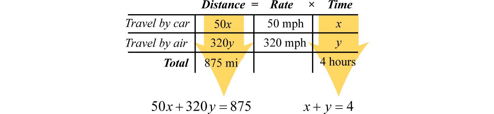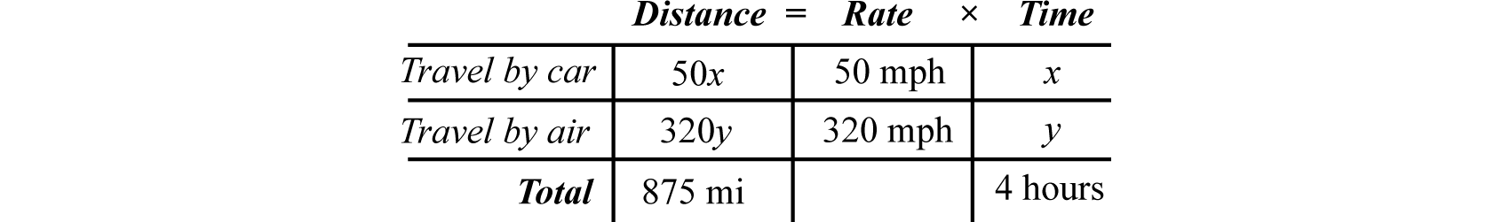 Recall that the distance traveled is equal to the average rate times the time traveled at that rate, . These uniform motion problems usually have a lot of data, so it helps to first organize that data in a chart and then set up a linear system. In this section, you are encouraged to use two variables.
