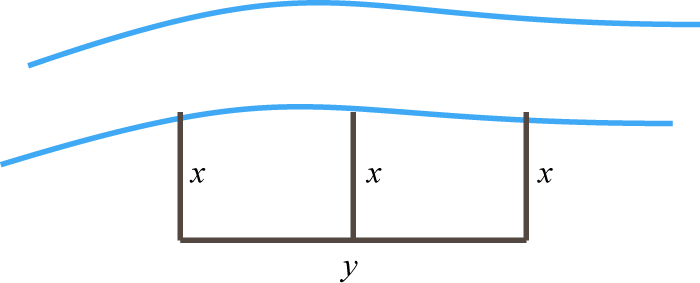 A partitioned rectangular pen next to a river is constructed with a total 136 feet of fencing (see illustration). If the outer fencing measures 114 feet, then find the dimensions of the pen.