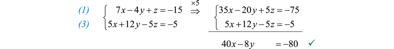 Because y has coefficient 1 in the second equation, choose to eliminate this variable. Use equations 1 and 2 to eliminate y.