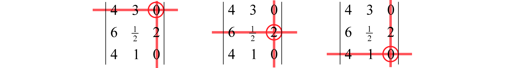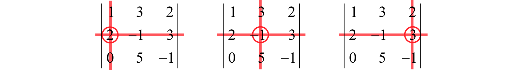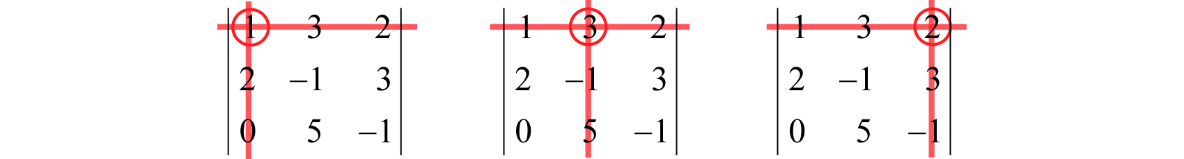 To easily determine the minor of each factor in the first row we line out the first row and the corresponding column. The determinant of the matrix of elements that remain determines the corresponding minor.