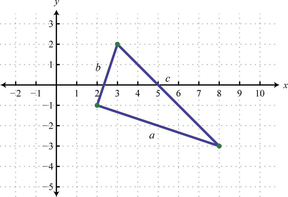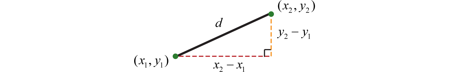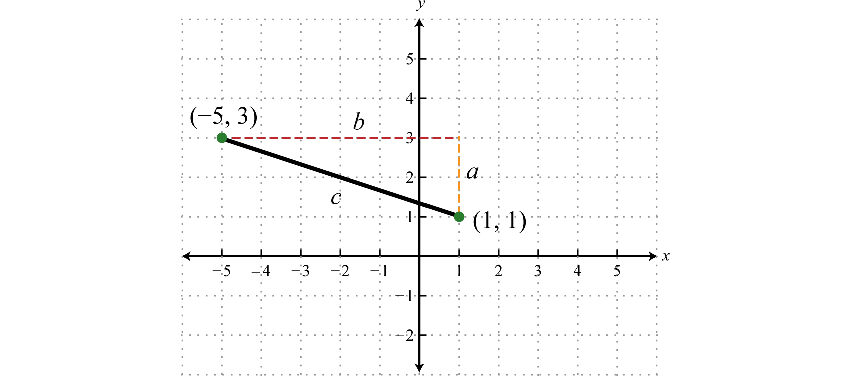 Frequently you need to calculate the distance between two points in a plane. To do this, form a right triangle using the two points as vertices of the triangle and then apply the Pythagorean theorem. Recall that the Pythagorean theorem states that if given any right triangle with legs measuring a and b units, then the square of the measure of the hypotenuse c is equal to the sum of the squares of the legs: In other words, the hypotenuse of any right triangle is equal to the square root of the sum of the squares of its legs.