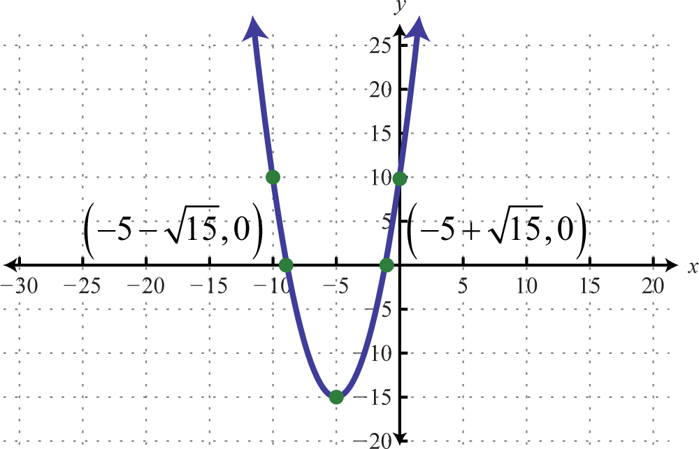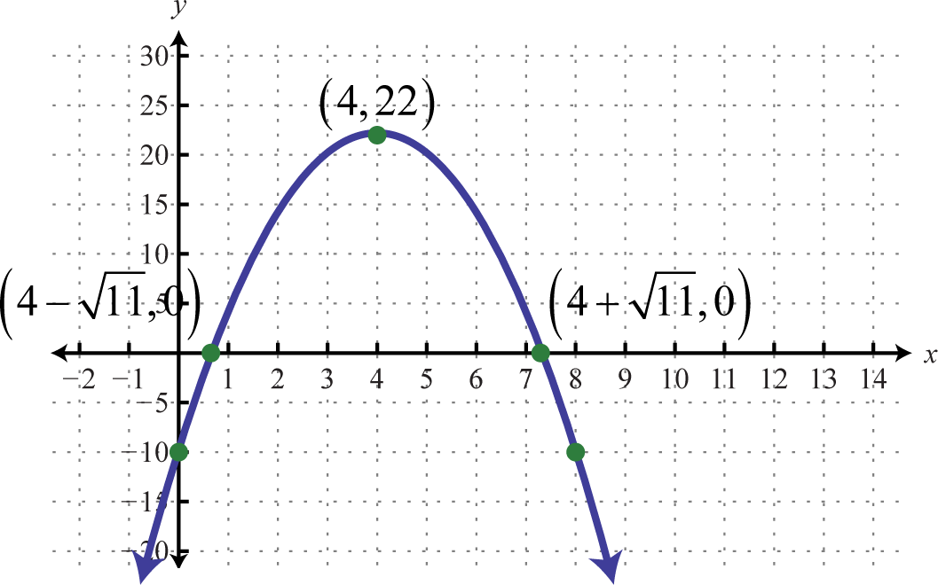 Approximating the x-intercepts using a calculator will help us plot the points. However, we will present the exact x-intercepts on the graph. Next, find the vertex.