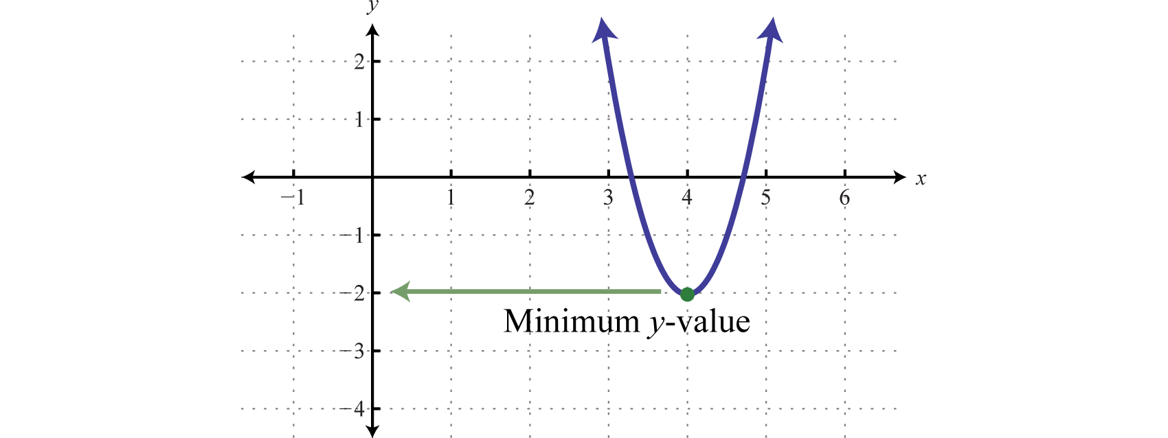 The vertex is (4, −2). Therefore, the minimum y-value of −2 occurs where x = 4, as illustrated below: