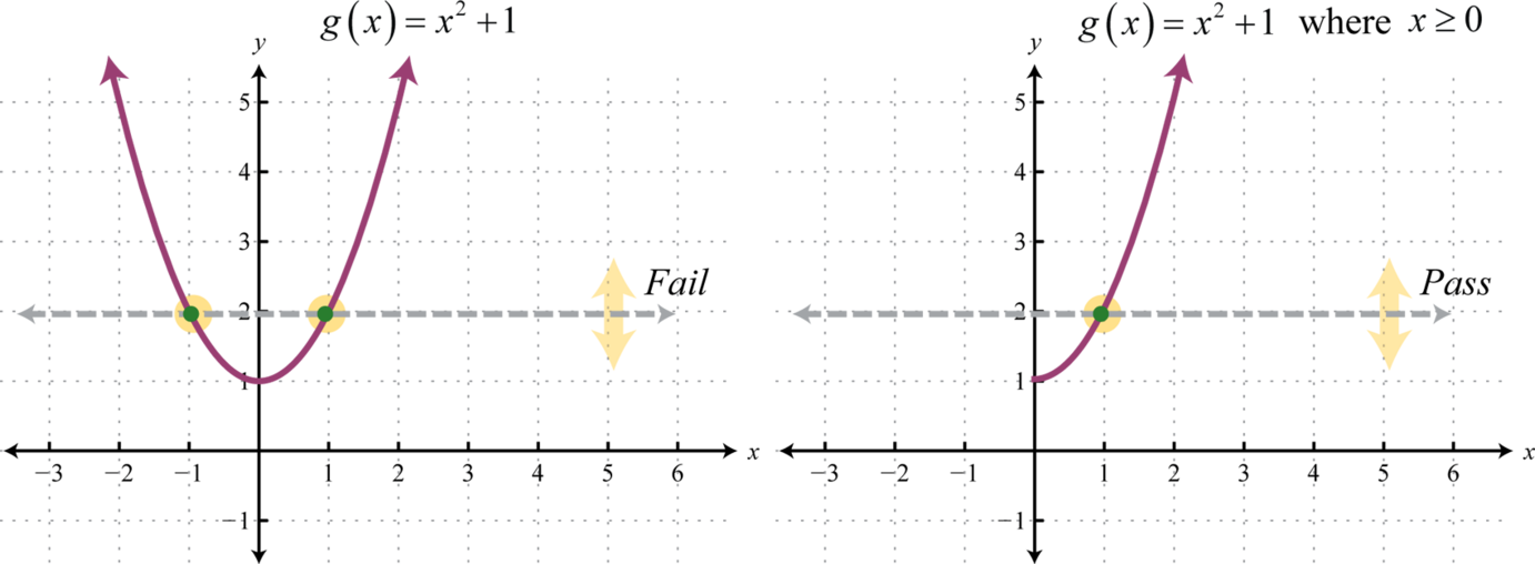 The horizontal line represents a value in the range and the number of intersections with the graph represents the number of values it corresponds to in the domain. The function defined by is one-to-one and the function defined by is not. Determining whether or not a function is one-to-one is important because a function has an inverse if and only if it is one-to-one. In other words, a function has an inverse if it passes the horizontal line test.