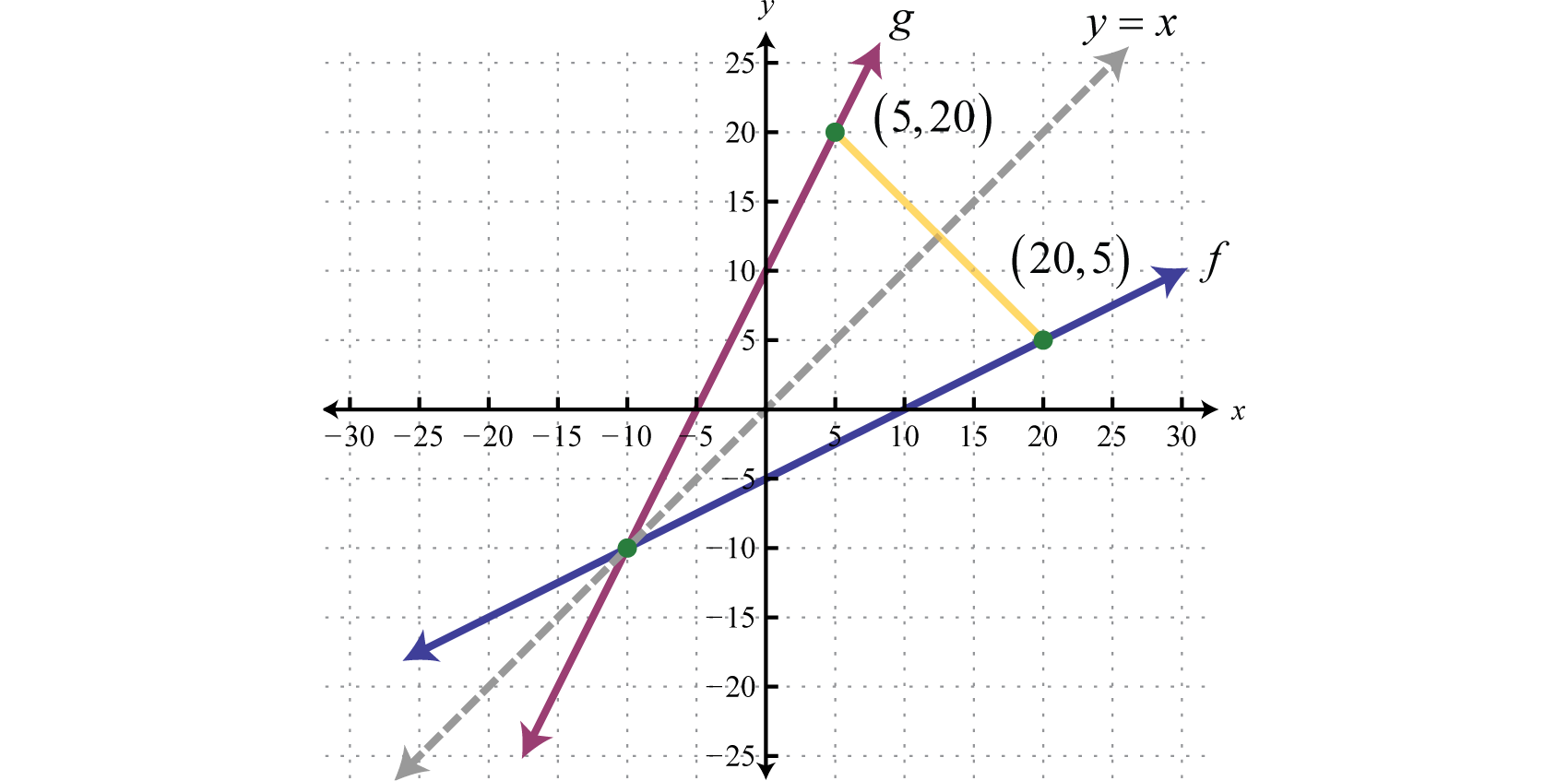 Note that there is symmetry about the line ; the graphs of f and g are mirror images about this line. Also notice that the point (20, 5) is on the graph of f and that (5, 20) is on the graph of g. Both of these observations are true in general and we have the following properties of inverse functions: