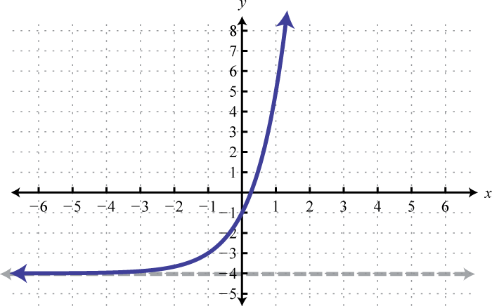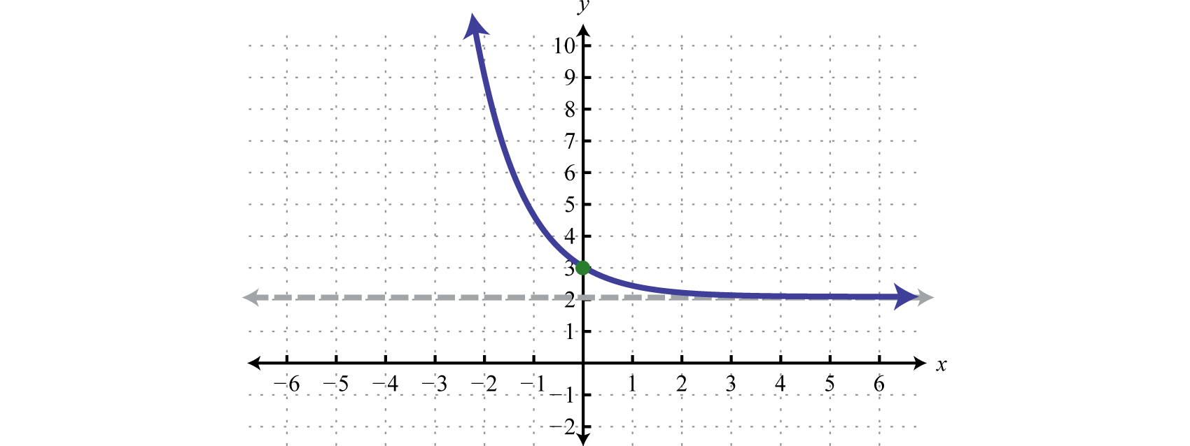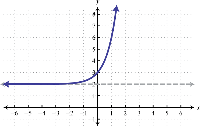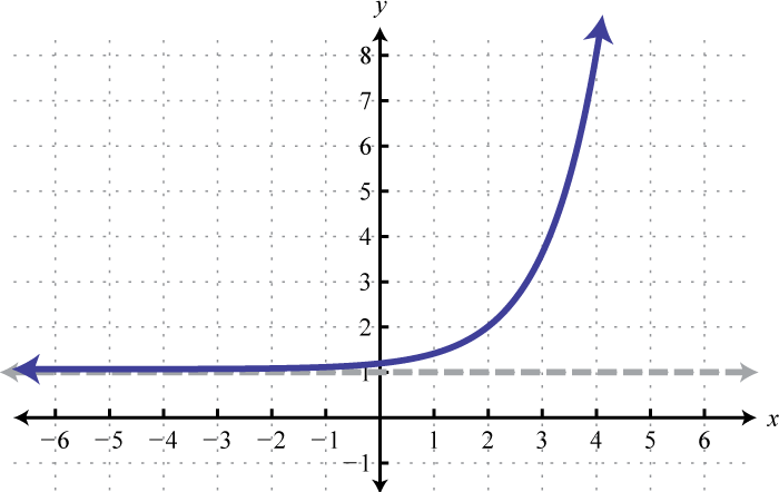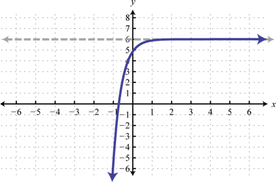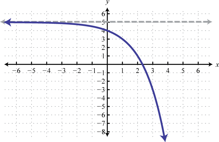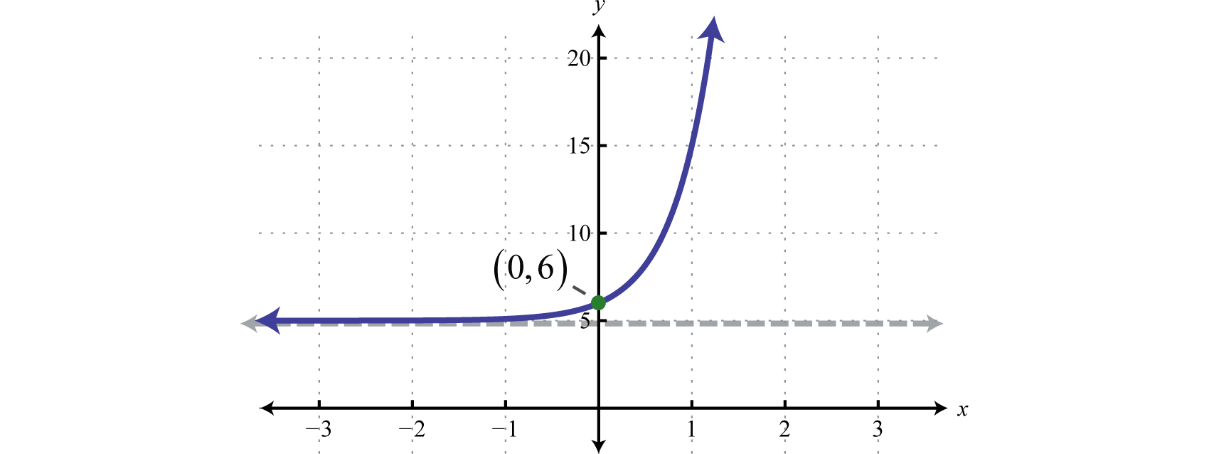 Note that the horizontal asymptote of the basic graph was shifted up 5 units to (shown dashed). Take a minute to evaluate a few values of x with your calculator and convince yourself that the result will never be less than 5.