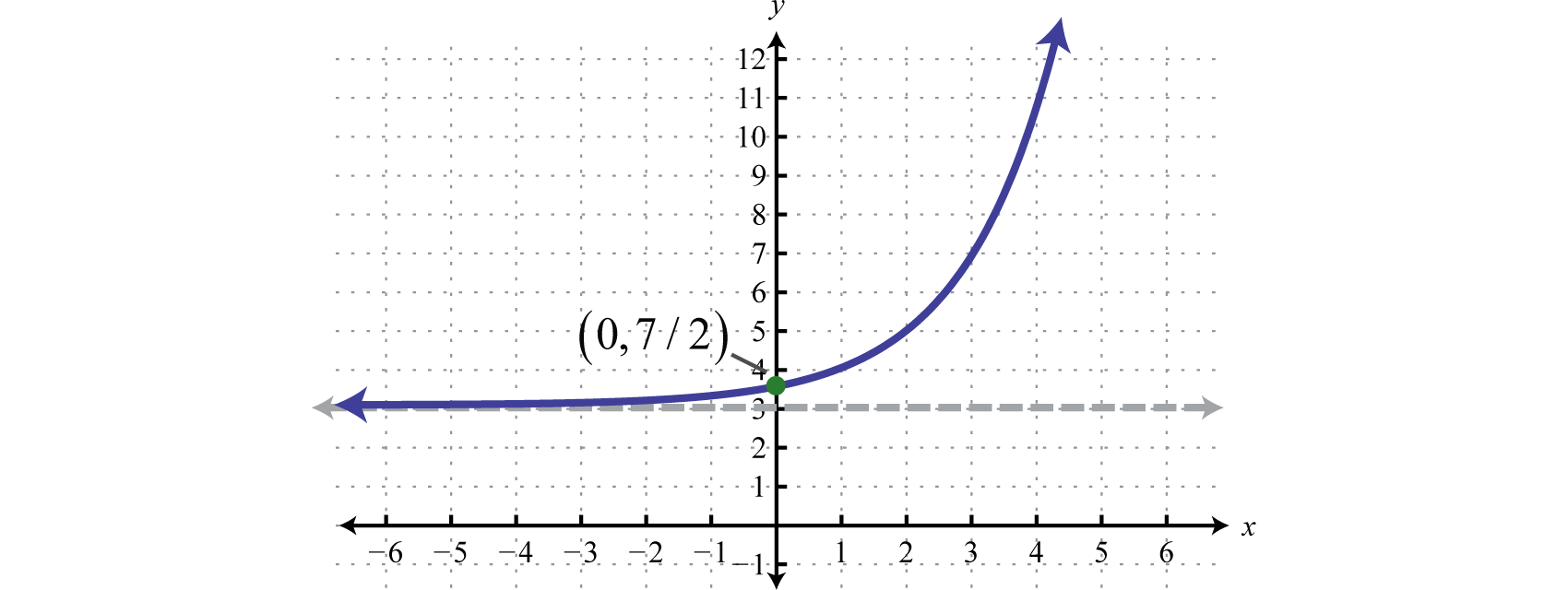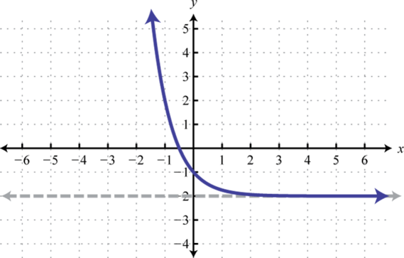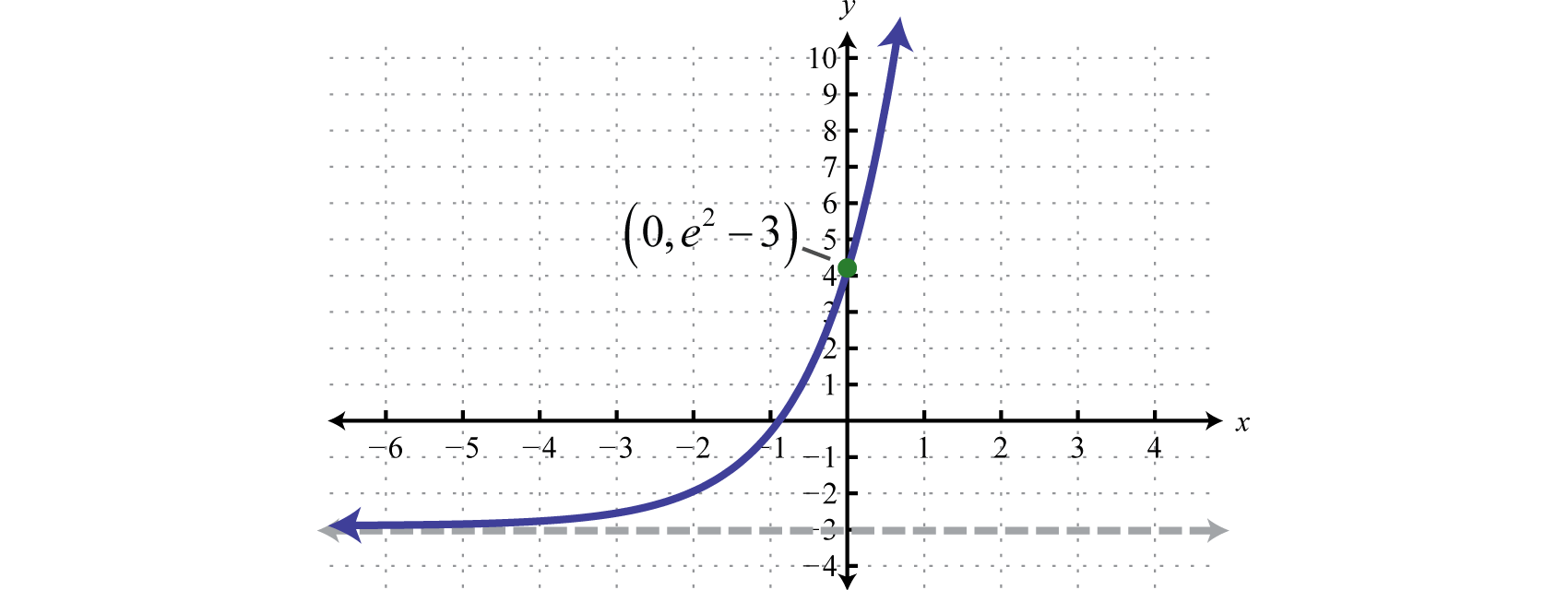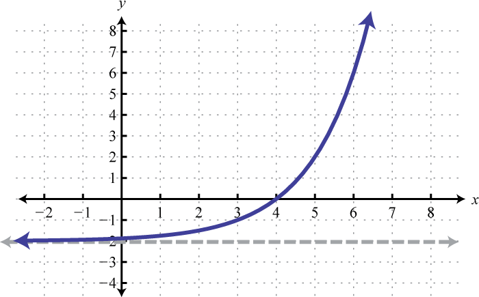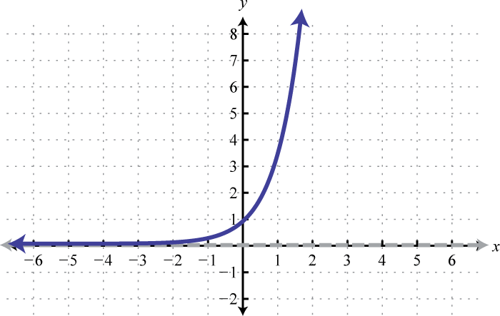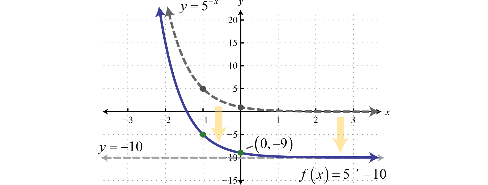 Note that the horizontal asymptote of the basic graph was shifted up 5 units to (shown dashed). Take a minute to evaluate a few values of x with your calculator and convince yourself that the result will never be less than 5.