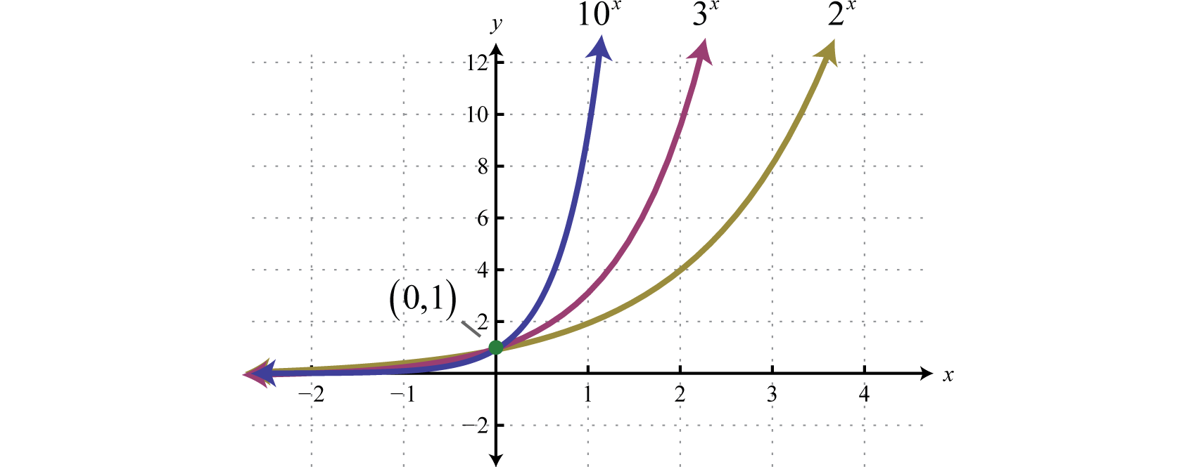 Note that all of these exponential functions have the same y-intercept, namely This is because for any function defined using the form As the functions are read from left to right, they are interpreted as increasing or growing exponentially. Furthermore, any exponential function of this form will have a domain that consists of all real numbers and a range that consists of positive values bounded by a horizontal asymptote at