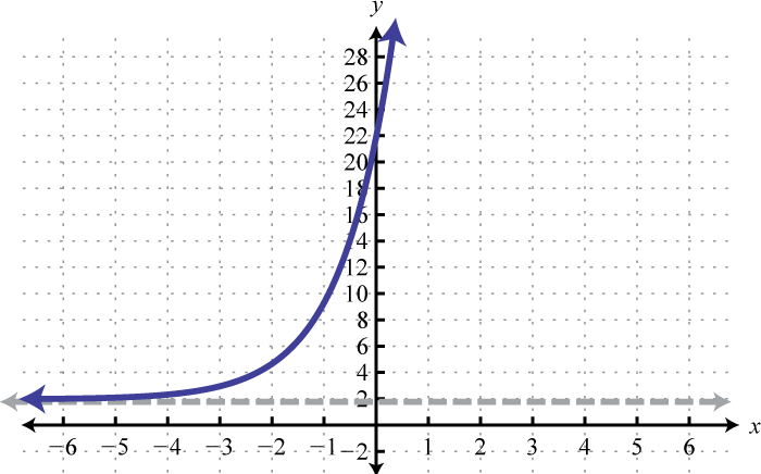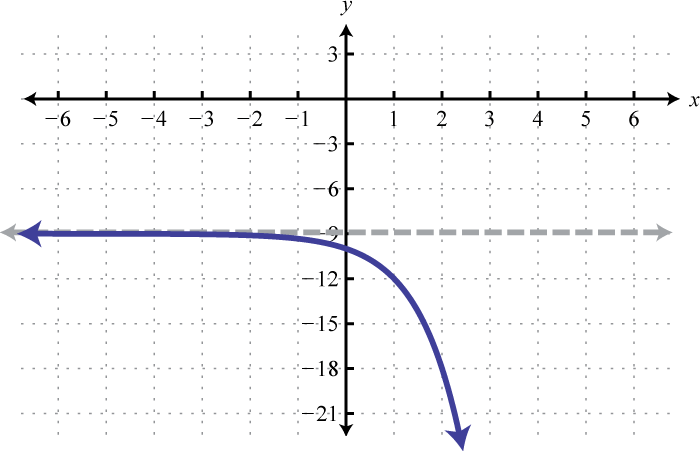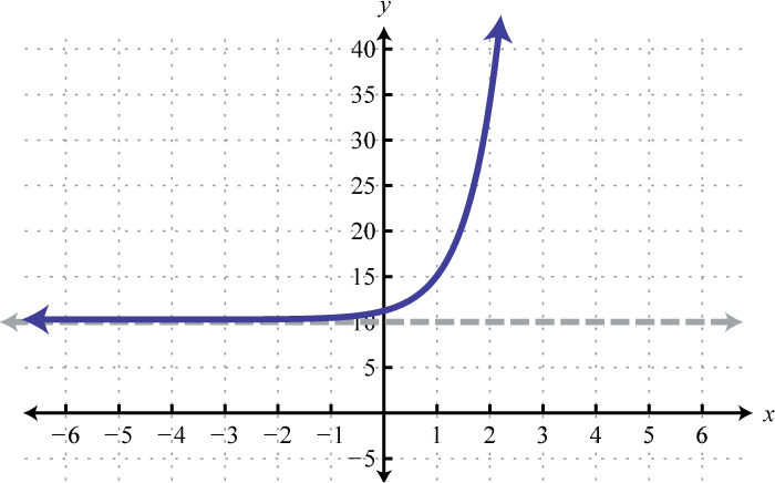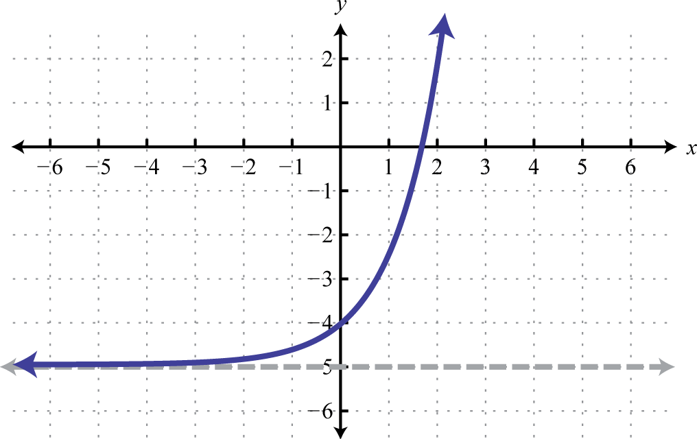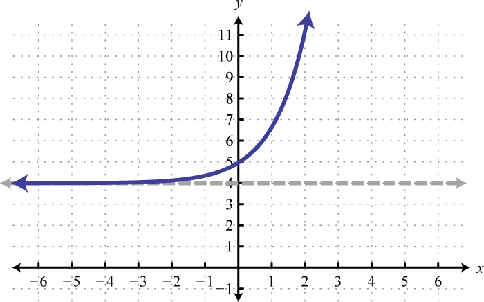 Sketch the exponential function. Draw the horizontal asymptote with a dashed line.
