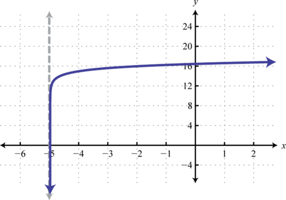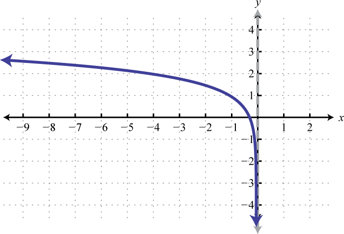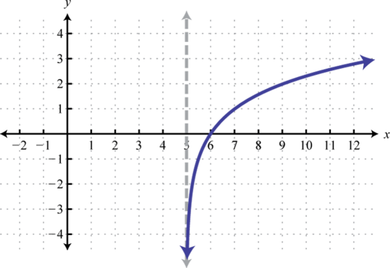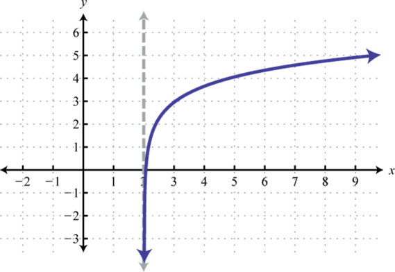 Sketch the graph of the logarithmic function. Draw the vertical asymptote with a dashed line.