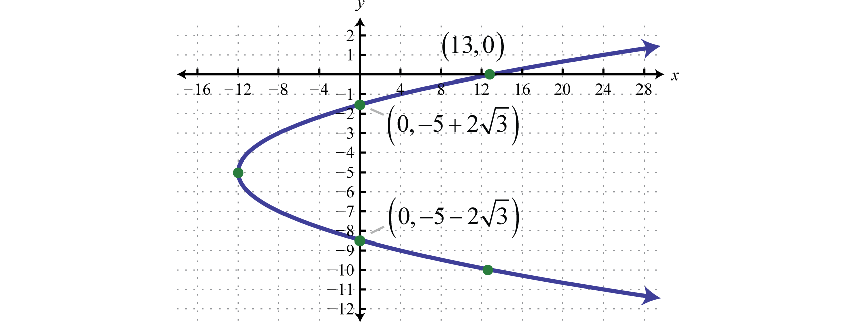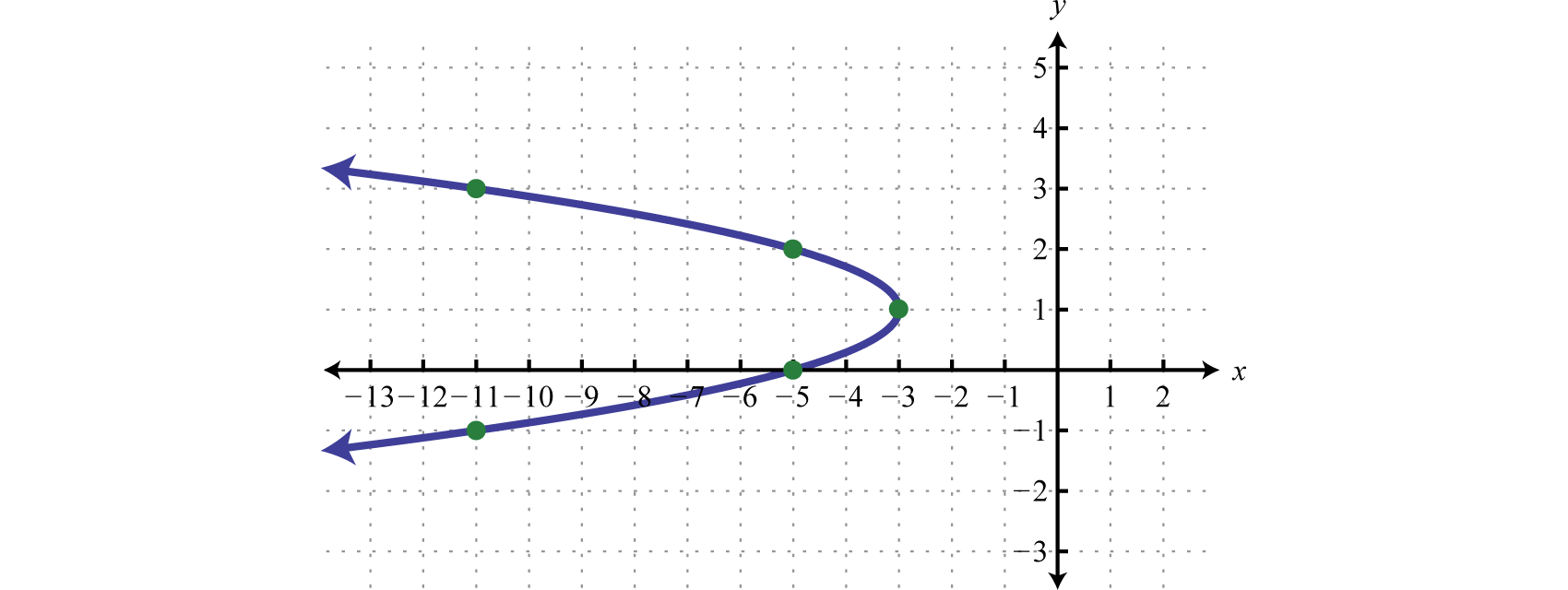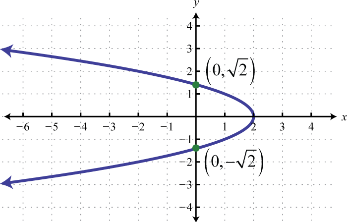 Therefore, from vertex form, , we can see that the vertex is Because the vertex is at and the parabola opens to the left, we can conclude that there are no y-intercepts. Since we only have two points, choose some y-values and find the corresponding x-values.