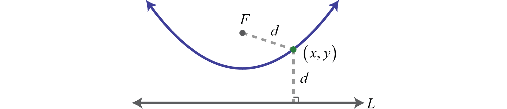 A parabolaThe set of points in a plane equidistant from a given line, called the directrix, and a point not on the line, called the focus. is the set of points in a plane equidistant from a given line, called the directrix, and a point not on the line, called the focus. In other words, if given a line L the directrix, and a point F the focus, then is a point on the parabola if the shortest distance from it to the focus and from it to the line is equal as pictured below: