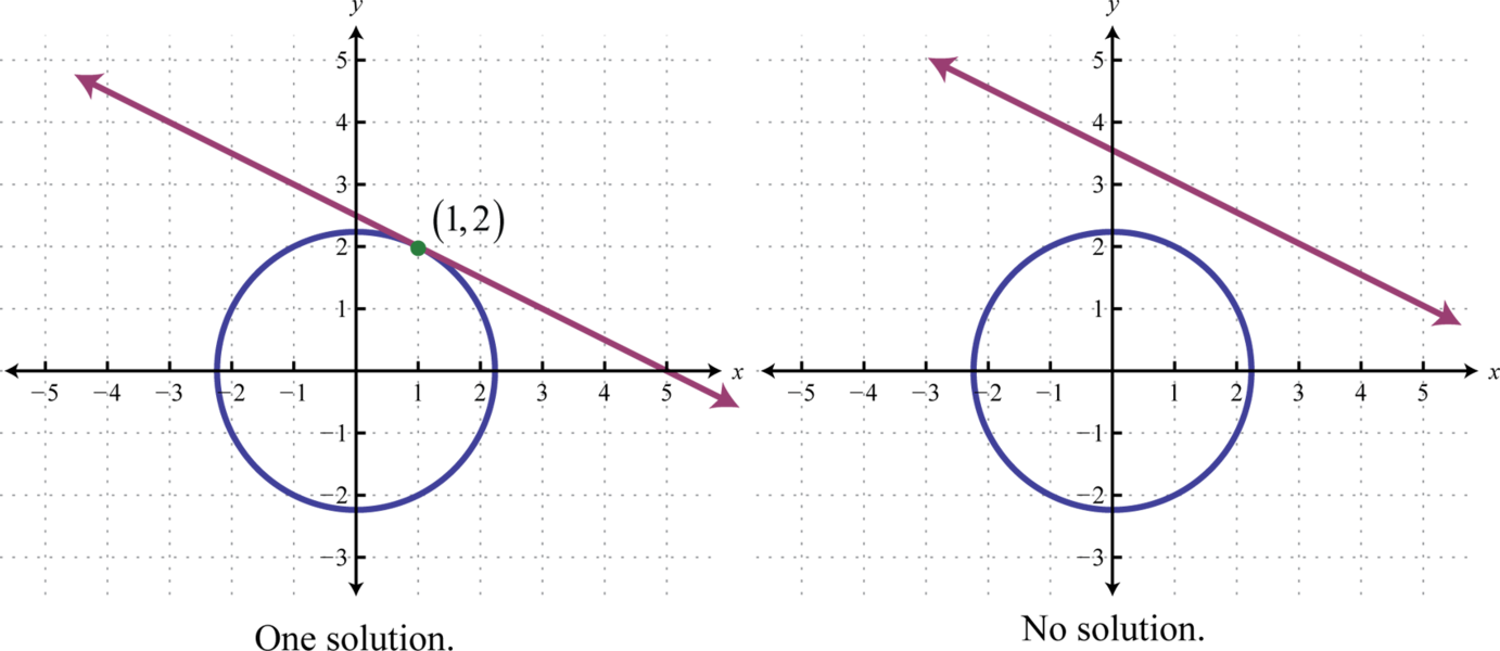 If we are given a system consisting of a circle and a line, then there are 3 possibilities for real solutions—two solutions as pictured above, one solution, or no solution.