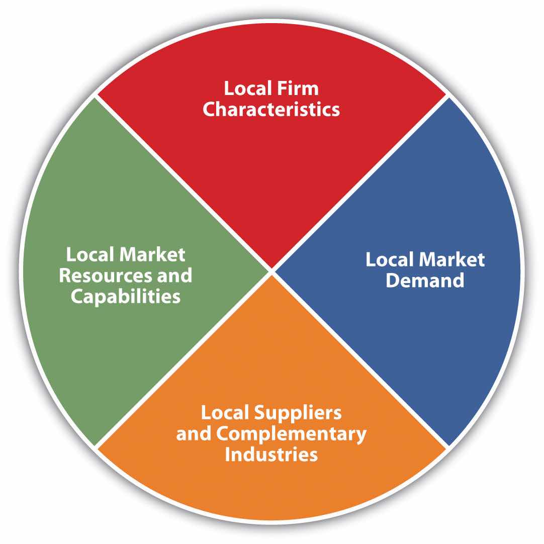 The concept of an innovation hubA geographic region that contains a cluster of company R&D centers, universities, and government research institutes in close proximity. is based on Harvard Business School Professor Michael Porter’s concept of clusters, which he defined in his book The Competitive Advantage of Nations. A cluster is defined as “a geographic concentration of business initiatives, suppliers and associated institutions in a particular field.”Juan A. Bertolin, “Convoy Model: The Dynamic Perspective of Porter’s Cluster Model,” Innovation Management, December 8, 2010, accessed March 10, 2011, http://www.innovationmanagement.se/2010/12/08/convoy-model-the-dynamic-perspective-of-porters-cluster-model. This particular model of location advantage is summarized in Figure 13.1 "Determinants of Location Advantages". For example, Silicon Valley in California is a cluster for technology companies that have located (or were founded) there. The partnerships and cross-pollination of ideas among the companies created new high-tech businesses whose success in turn brought venture capitalists (VCs) there. VCs looked for new ideas to fund, which led to more high-tech start-ups, thus stimulating even further innovation and new business creation.