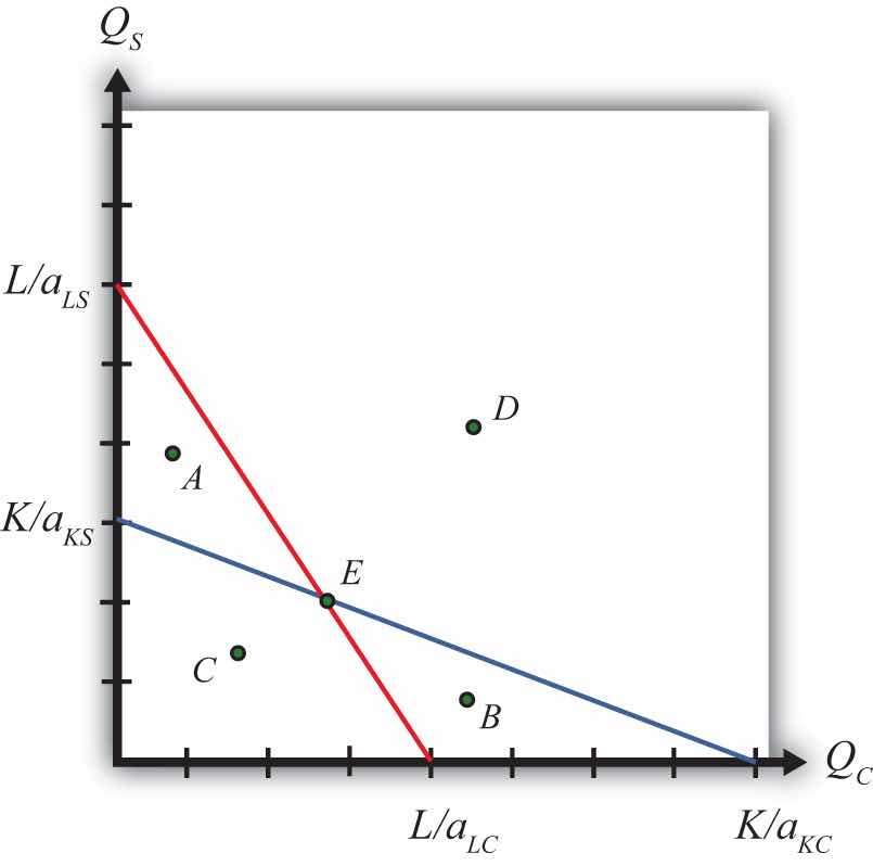 We graph the two constraints in Figure 5.1 "The Labor and Capital Constraints". The red line is the labor constraint. The endpoints and represent the maximum quantities of clothing and steel that could be produced if all the labor endowments were allocated to clothing and steel production, respectively. All points on the line represent combinations of clothing and steel outputs that could employ all the labor available in the economy. Points outside the constraint, such as B and D, are not feasible production points since there are insufficient labor resources. All points on or within the line, such as A, C, and E, are feasible. The slope of the labor constraint is .