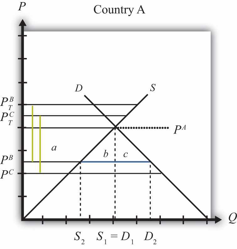 Since, with the tariffs, the autarky price in Country A, labeled PA in Figure 9.12 "Trade Creation", is less than the tariff-ridden prices PTB and PTC, the product will not be imported. Instead, Country A will supply its own domestic demand at S1 = D1. In this case, the original tariffs are prohibitive.