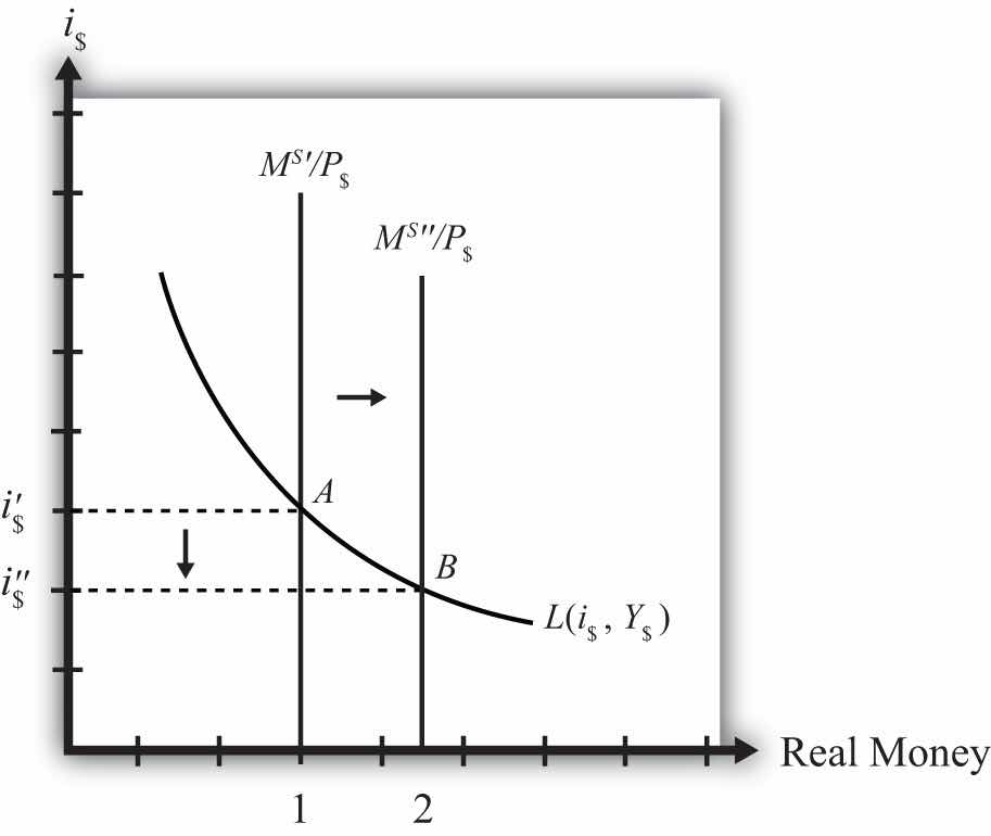 The final equilibrium will occur at point B on the diagram. The real money supply will have risen from level 1 to 2 while the equilibrium interest rate has fallen from i$′ to i$″. Thus expansionary monetary policy (i.e., an increase in the money supply) will cause a decrease in average interest rates in an economy. In contrast, contractionary monetary policy (a decrease in the money supply) will cause an increase in average interest rates in an economy.