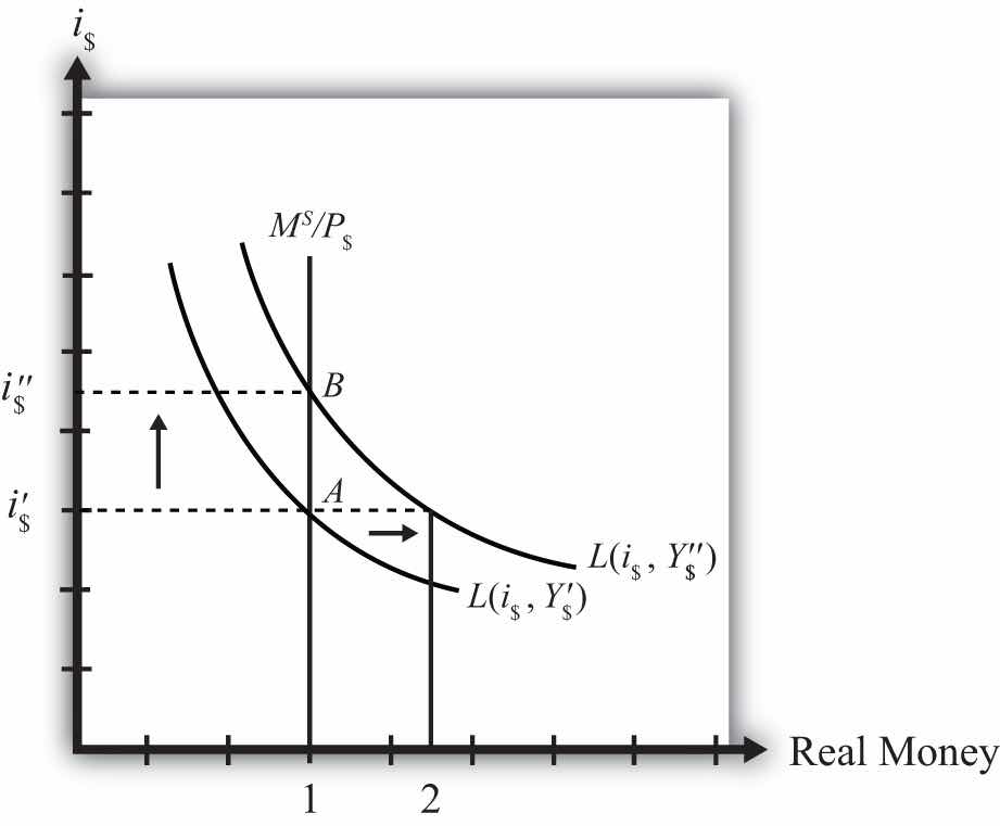 At the original interest rate, i$′, real money demand has increased to level 2 along the horizontal axis while real money supply remains at level 1. This means that real money demand exceeds real money supply and the current interest rate is lower than the equilibrium rate. Adjustment to the higher interest rate will follow the “interest rate too low” equilibrium story.
