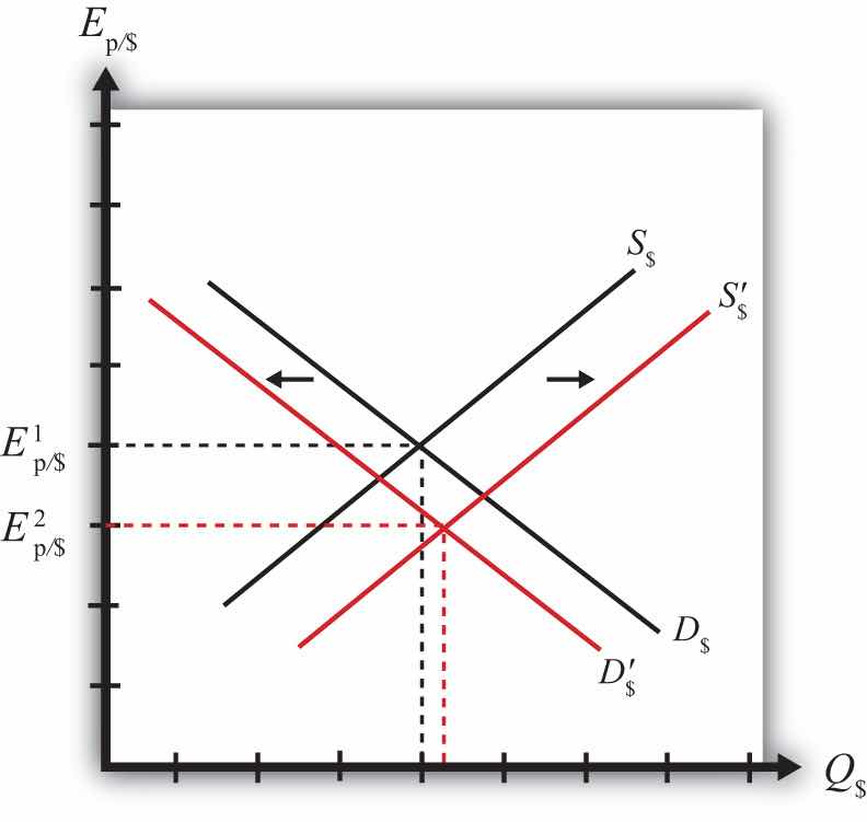 The price discrepancies should lead consumers in the United States or importing firms to purchase less expensive goods in Mexico. To do so, they will raise the supply of dollars in the Forex in exchange for pesos. Thus the supply curve of dollars will shift to the right as shown in Figure 6.2 "Forex Adjustment When ". At the same time, Mexican consumers would refrain from purchasing the more expensive U.S. goods. This would lead to a reduction in demand for dollars in exchange for pesos on the Forex. Hence, the demand curve for dollars shifts to the left. Due to the demand decrease and the supply increase, the exchange rate (Ep/$) falls. This means that the dollar depreciates and the peso appreciates.